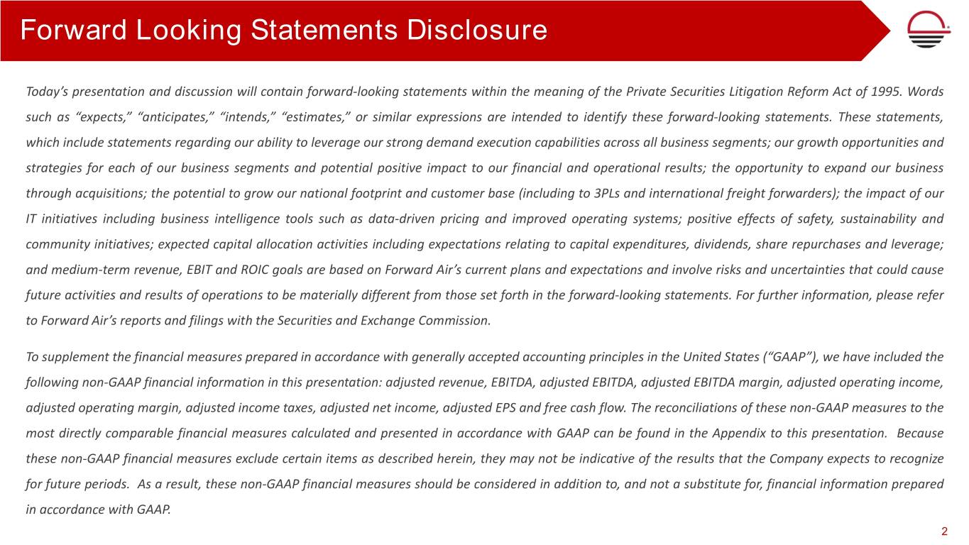 Forward Looking Statements Disclosure Today’s presentation and discussion will contain forward-looking statements within the meaning of the Private Securities Litigation Reform Act of 1995. Words such as “expects,” “anticipates,” “intends,” “estimates,” or similar expressions are intended to identify these forward-looking statements. These statements, which include statements regarding our ability to leverage our strong demand execution capabilities across all business segments; our growth opportunities and strategies for each of our business segments and potential positive impact to our financial and operational results; the opportunity to expand our business through acquisitions; the potential to grow our national footprint and customer base (including to 3PLs and international freight forwarders); the impact of our IT initiatives including business intelligence tools such as data-driven pricing and improved operating systems; positive effects of safety, sustainability and community initiatives; expected capital allocation activities including expectations relating to capital expenditures, dividends, share repurchases and leverage; and medium-term revenue, EBIT and ROIC goals are based on Forward Air’s current plans and expectations and involve risks and uncertainties that could cause future activities and results of operations to be materially different from those set forth in the forward-looking statements. For further information, please refer to Forward Air’s reports and filings with the Securities and Exchange Commission. To supplement the financial measures prepared in accordance with generally accepted accounting principles in the United States (“GAAP”), we have included the following non-GAAP financial information in this presentation: adjusted revenue, EBITDA, adjusted EBITDA, adjusted EBITDA margin, adjusted operating income, adjusted operating margin, adjusted income taxes, adjusted net income, adjusted EPS and free cash flow. The reconciliations of these non-GAAP measures to the most directly comparable financial measures calculated and presented in accordance with GAAP can be found in the Appendix to this presentation. Because these non-GAAP financial measures exclude certain items as described herein, they may not be indicative of the results that the Company expects to recognize for future periods. As a result, these non-GAAP financial measures should be considered in addition to, and not a substitute for, financial information prepared in accordance with GAAP. 2