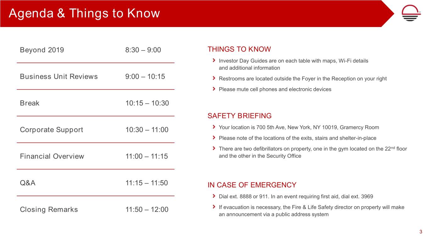 Agenda & Things to Know Beyond 2019 8:30 – 9:00 THINGS TO KNOW Investor Day Guides are on each table with maps, Wi-Fi details and additional information Business Unit Reviews 9:00 – 10:15 Restrooms are located outside the Foyer in the Reception on your right Please mute cell phones and electronic devices Break 10:15 – 10:30 SAFETY BRIEFING Your location is 700 5th Ave, New York, NY 10019, Gramercy Room Corporate Support 10:30 – 11:00 Please note of the locations of the exits, stairs and shelter-in-place There are two defibrillators on property, one in the gym located on the 22nd floor Financial Overview 11:00 – 11:15 and the other in the Security Office Q&A 11:15 – 11:50 IN CASE OF EMERGENCY Dial ext. 8888 or 911. In an event requiring first aid, dial ext. 3969 Closing Remarks 11:50 – 12:00 If evacuation is necessary, the Fire & Life Safety director on property will make an announcement via a public address system 3