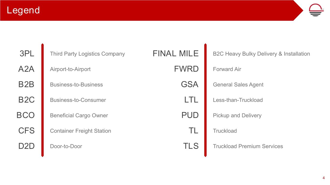 Legend 3PL Third Party Logistics Company FINAL MILE B2C Heavy Bulky Delivery & Installation A2A Airport-to-Airport FWRD Forward Air B2B Business-to-Business GSA General Sales Agent B2C Business-to-Consumer LTL Less-than-Truckload BCO Beneficial Cargo Owner PUD Pickup and Delivery CFS Container Freight Station TL Truckload D2D Door-to-Door TLS Truckload Premium Services 4