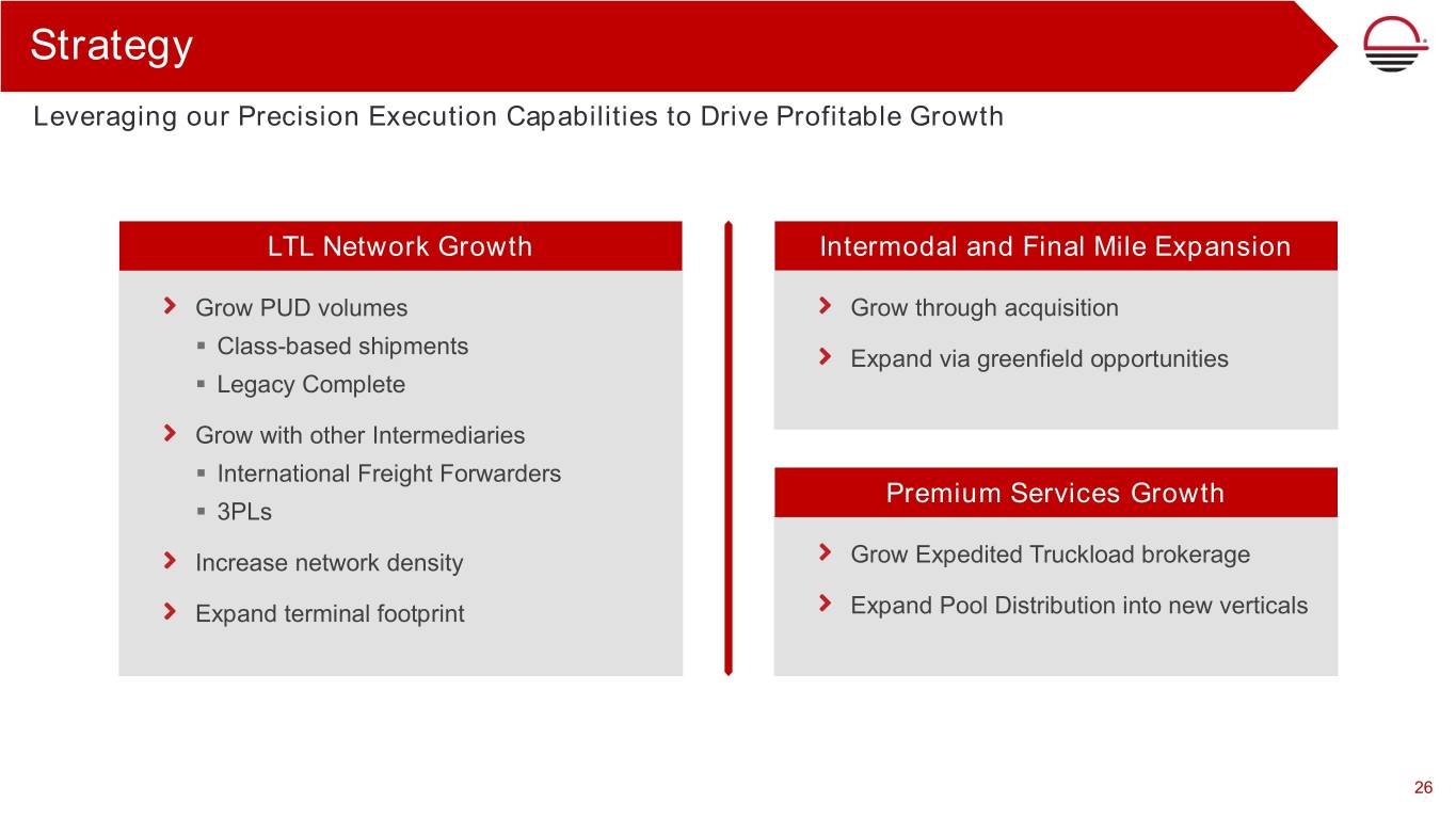 Strategy Leveraging our Precision Execution Capabilities to Drive Profitable Growth LTL Network Growth Intermodal and Final Mile Expansion Grow PUD volumes Grow through acquisition . Class-based shipments Expand via greenfield opportunities . Legacy Complete Grow with other Intermediaries . International Freight Forwarders Premium Services Growth . 3PLs Increase network density Grow Expedited Truckload brokerage Expand terminal footprint Expand Pool Distribution into new verticals 26