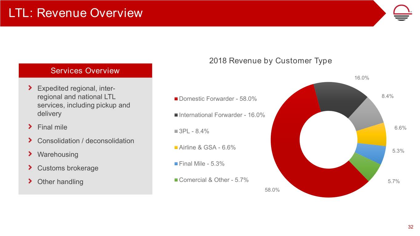 LTL: Revenue Overview 2018 Revenue by Customer Type Services Overview 16.0% Expedited regional, inter- regional and national LTL Domestic Forwarder - 58.0% 8.4% services, including pickup and delivery International Forwarder - 16.0% Final mile 6.6% 3PL - 8.4% Consolidation / deconsolidation Airline & GSA - 6.6% 5.3% Warehousing Final Mile - 5.3% Customs brokerage Other handling Comercial & Other - 5.7% 5.7% 58.0% 32