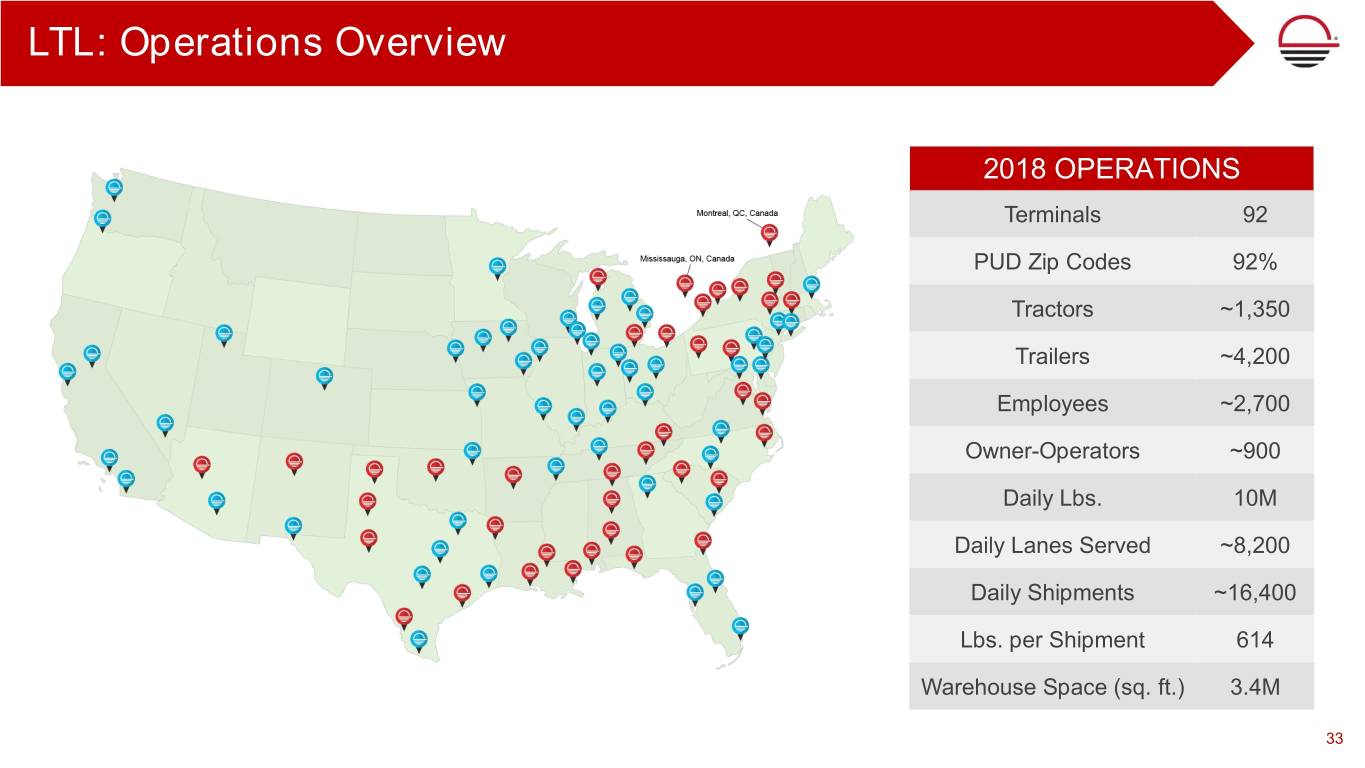 LTL: Operations Overview 2018 OPERATIONS Terminals 92 PUD Zip Codes 92% Tractors ~1,350 Trailers ~4,200 Employees ~2,700 Owner-Operators ~900 Daily Lbs. 10M Daily Lanes Served ~8,200 Daily Shipments ~16,400 Lbs. per Shipment 614 Warehouse Space (sq. ft.) 3.4M 33