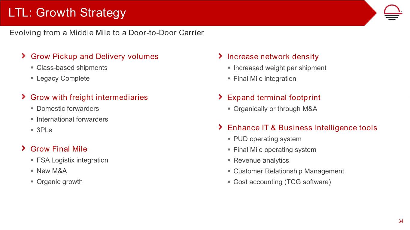 LTL: Growth Strategy Evolving from a Middle Mile to a Door-to-Door Carrier Grow Pickup and Delivery volumes Increase network density . Class-based shipments . Increased weight per shipment . Legacy Complete . Final Mile integration Grow with freight intermediaries Expand terminal footprint . Domestic forwarders . Organically or through M&A . International forwarders . 3PLs Enhance IT & Business Intelligence tools . PUD operating system Grow Final Mile . Final Mile operating system . FSA Logistix integration . Revenue analytics . New M&A . Customer Relationship Management . Organic growth . Cost accounting (TCG software) 34