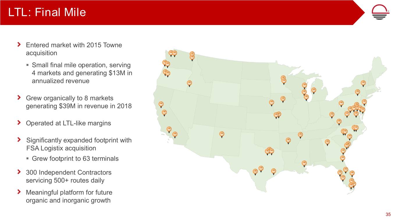 LTL: Final Mile Entered market with 2015 Towne acquisition . Small final mile operation, serving 4 markets and generating $13M in annualized revenue Grew organically to 8 markets generating $39M in revenue in 2018 Operated at LTL-like margins Significantly expanded footprint with FSA Logistix acquisition . Grew footprint to 63 terminals 300 Independent Contractors servicing 500+ routes daily Meaningful platform for future organic and inorganic growth 35