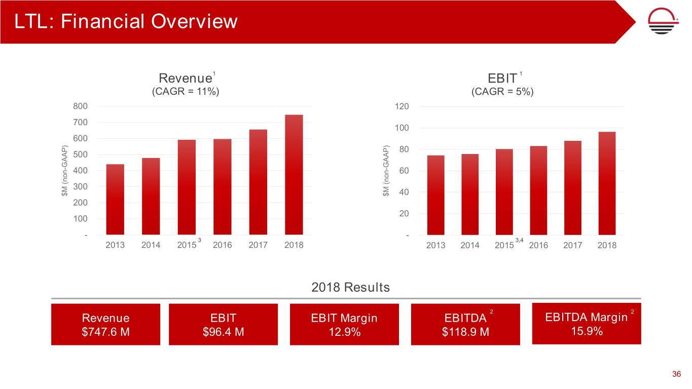 LTL: Financial Overview Revenue 1 EBIT 1 (CAGR = 11%) (CAGR = 5%) 800 120 700 100 600 80 500 GAAP) GAAP) - 400 - 60 300 $M $M (non $M $M (non 40 200 20 100 - - 3 3,4 2013 2014 2015 2016 2017 2018 2013 2014 2015 2016 2017 2018 2018 Results 2 2 2 Revenue EBIT EBIT Margin EBITDA EBITDA Margin $747.6 M $96.4 M 12.9% $118.9 M 15.9% 36