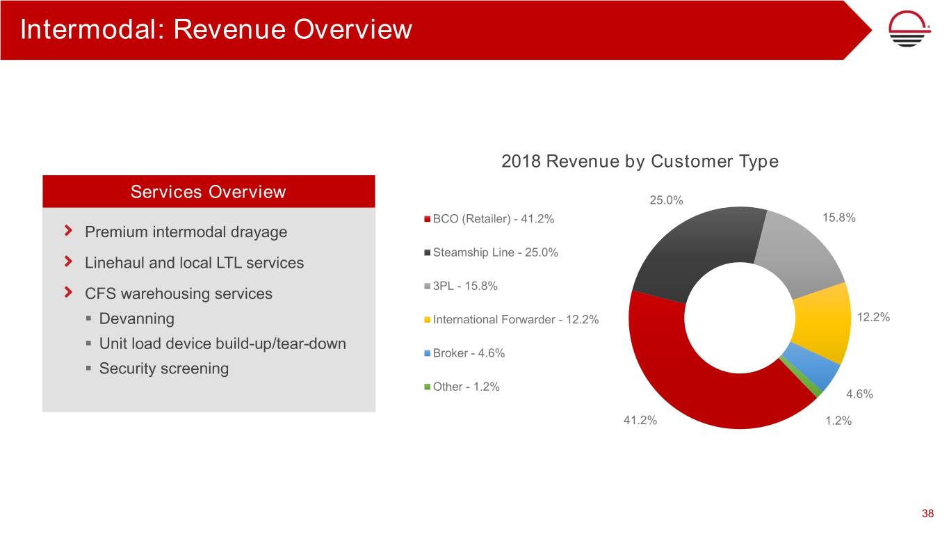 Intermodal: Revenue Overview 2018 Revenue by Customer Type Services Overview 25.0% BCO (Retailer) - 41.2% 15.8% Premium intermodal drayage Steamship Line - 25.0% Linehaul and local LTL services 3PL - 15.8% CFS warehousing services . Devanning International Forwarder - 12.2% 12.2% . Unit load device build-up/tear-down Broker - 4.6% . Security screening Other - 1.2% 4.6% 41.2% 1.2% 38