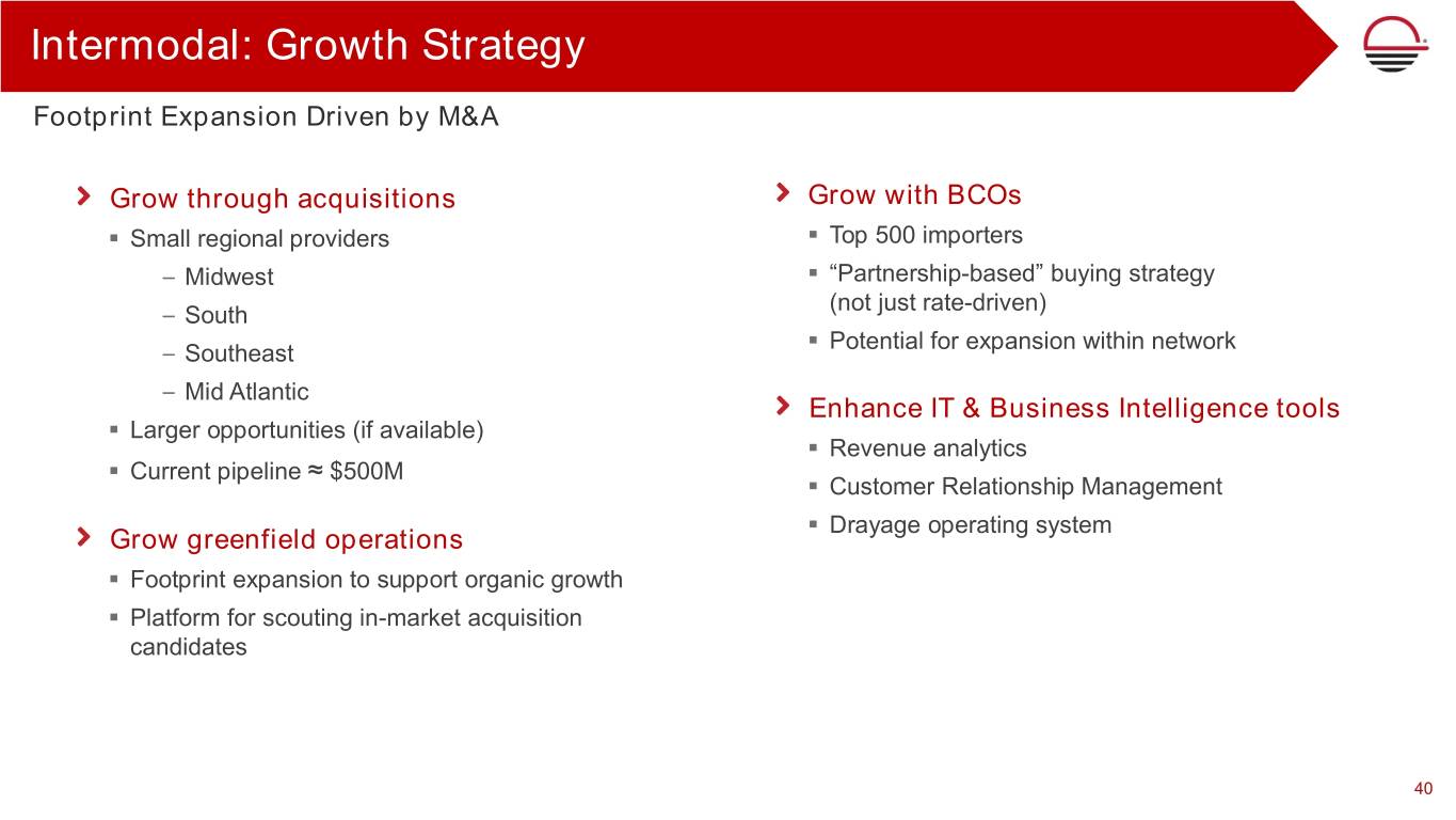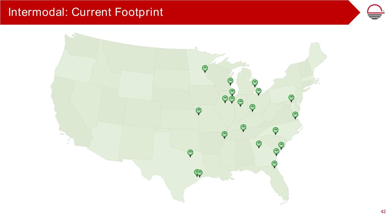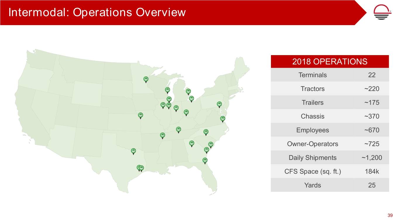 Intermodal: Operations Overview 2018 OPERATIONS Terminals 22 Tractors ~220 Trailers ~175 Chassis ~370 Employees ~670 Owner-Operators ~725 Daily Shipments ~1,200 CFS Space (sq. ft.) 184k Yards 25 39