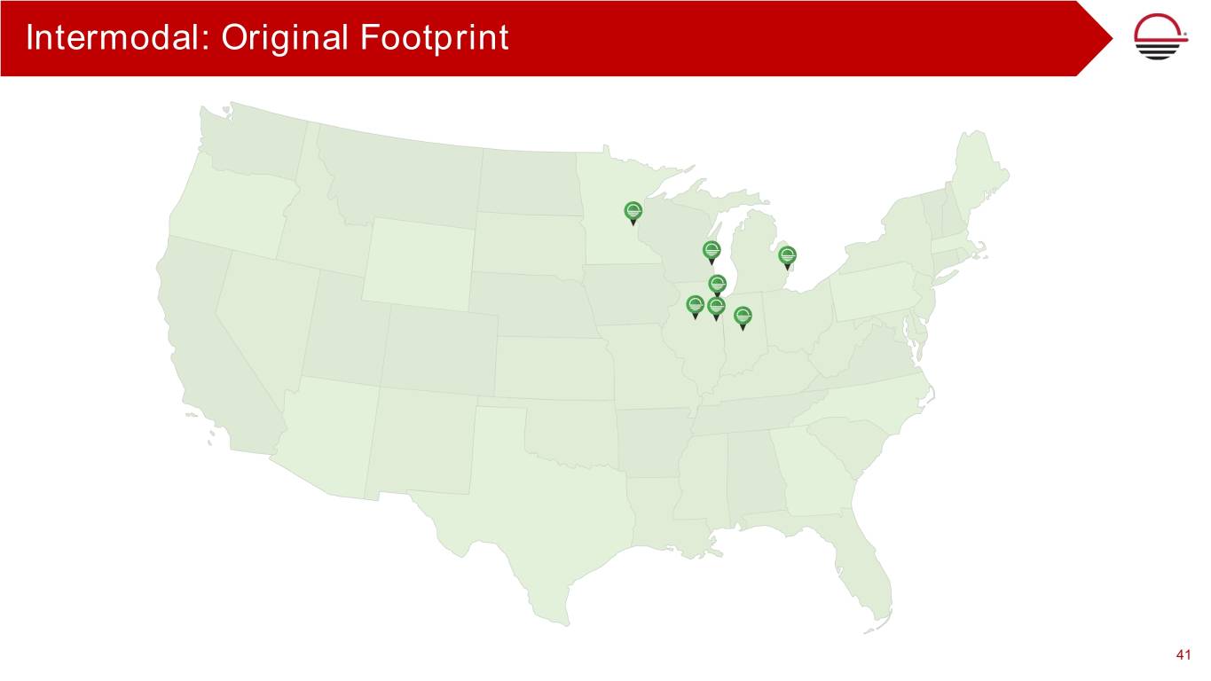 Intermodal: Growth Strategy Footprint Expansion Driven by M&A Grow through acquisitions Grow with BCOs . Small regional providers . Top 500 importers – Midwest . “Partnership-based” buying strategy (not just rate-driven) – South . Potential for expansion within network – Southeast – Mid Atlantic Enhance IT & Business Intelligence tools . Larger opportunities (if available) . Revenue analytics . Current pipeline ≈ $500M . Customer Relationship Management . Drayage operating system Grow greenfield operations . Footprint expansion to support organic growth . Platform for scouting in-market acquisition candidates 40