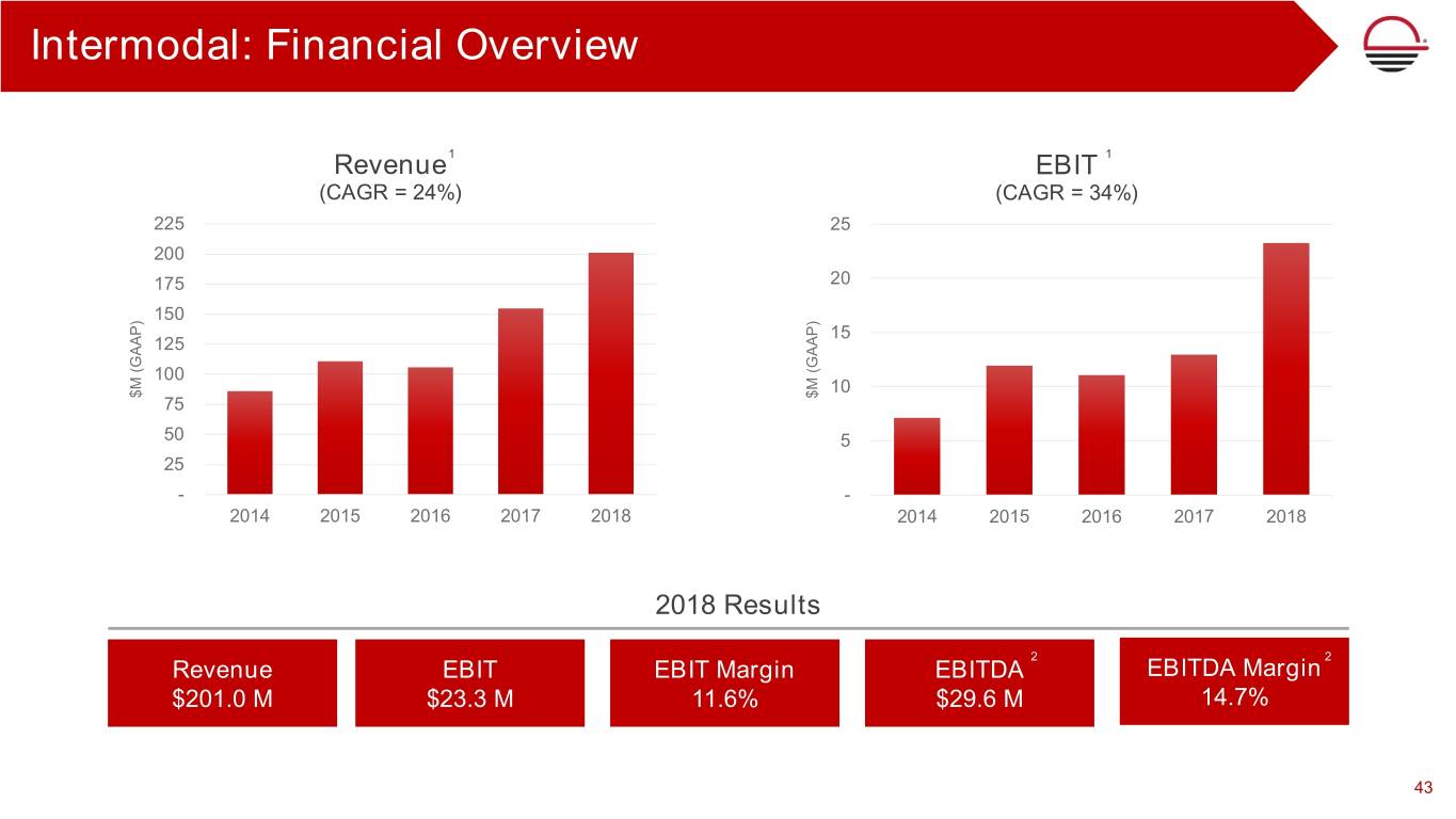 Intermodal: Financial Overview Revenue 1 EBIT 1 (CAGR = 24%) (CAGR = 34%) 225 25 200 175 20 150 15 125 100 (GAAP) 10 $M $M (GAAP) 75 $M 50 5 25 - - 2014 2015 2016 2017 2018 2014 2015 2016 2017 2018 2018 Results 2 2 Revenue EBIT EBIT Margin EBITDA EBITDA Margin $201.0 M $23.3 M 11.6% $29.6 M 14.7% 43