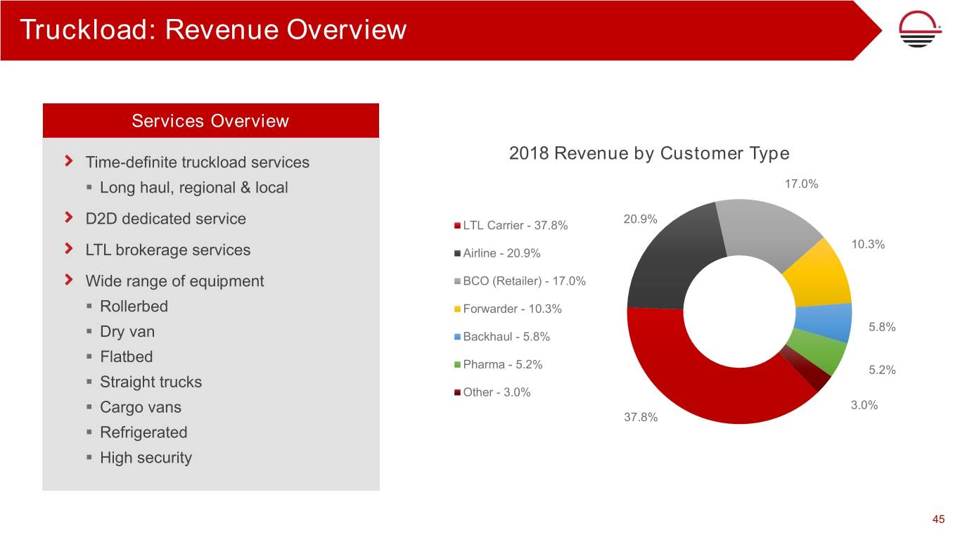 Truckload: Revenue Overview Services Overview Time-definite truckload services 2018 Revenue by Customer Type . Long haul, regional & local 17.0% 20.9% D2D dedicated service LTL Carrier - 37.8% 10.3% LTL brokerage services Airline - 20.9% Wide range of equipment BCO (Retailer) - 17.0% . Rollerbed Forwarder - 10.3% 5.8% . Dry van Backhaul - 5.8% . Flatbed Pharma - 5.2% 5.2% . Straight trucks Other - 3.0% . Cargo vans 3.0% 37.8% . Refrigerated . High security 45