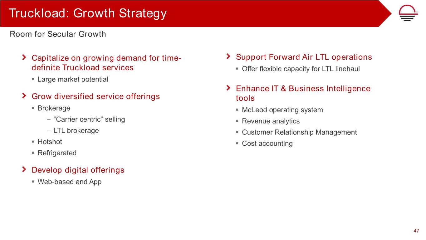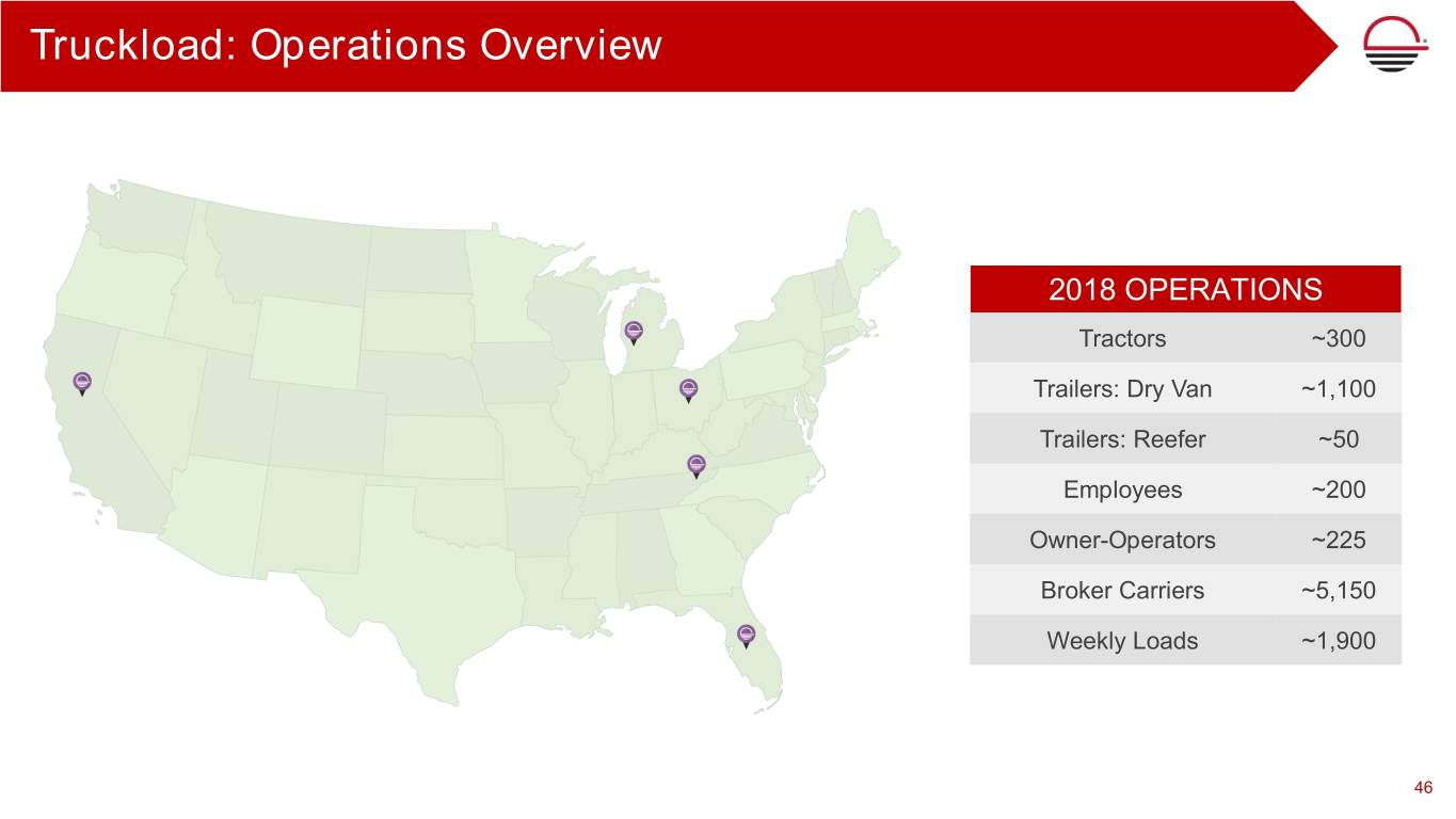 Truckload: Operations Overview 2018 OPERATIONS Tractors ~300 Trailers: Dry Van ~1,100 Trailers: Reefer ~50 Employees ~200 Owner-Operators ~225 Broker Carriers ~5,150 Weekly Loads ~1,900 46