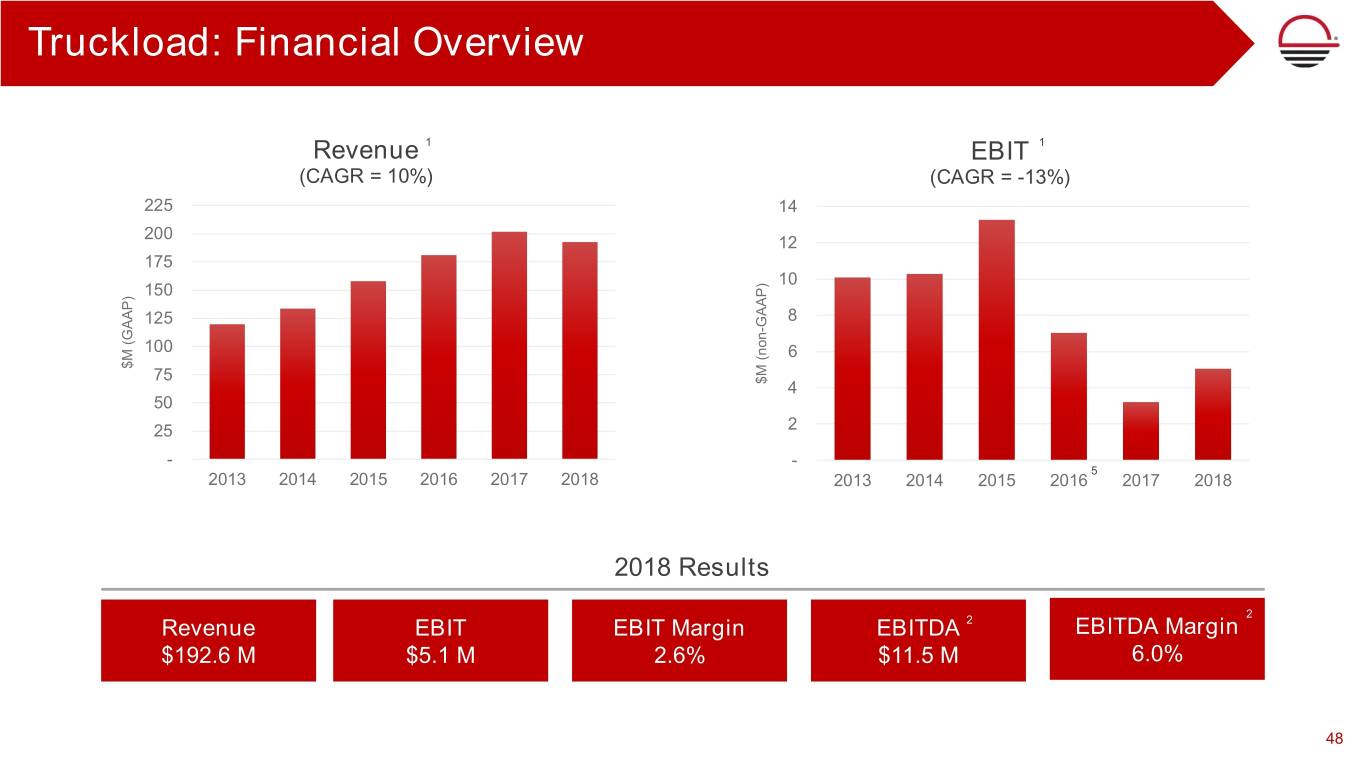 Truckload: Financial Overview Revenue 1 EBIT 1 (CAGR = 10%) (CAGR = -13%) 225 14 200 12 175 10 150 ) 8 125 GAAP) - (GAAP 100 6 $M $M 75 $M $M (non 4 50 25 2 - - 5 2013 2014 2015 2016 2017 2018 2013 2014 2015 2016 2017 2018 2018 Results 2 Revenue EBIT EBIT Margin EBITDA 2 EBITDA Margin $192.6 M $5.1 M 2.6% $11.5 M 6.0% 48