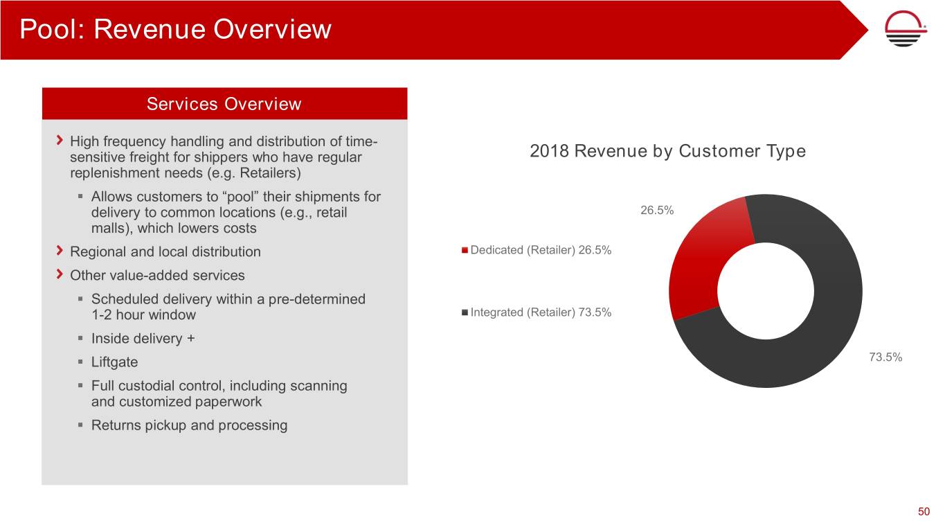 Pool: Revenue Overview Services Overview High frequency handling and distribution of time- sensitive freight for shippers who have regular 2018 Revenue by Customer Type replenishment needs (e.g. Retailers) . Allows customers to “pool” their shipments for delivery to common locations (e.g., retail 26.5% malls), which lowers costs Regional and local distribution Dedicated (Retailer) 26.5% Other value-added services . Scheduled delivery within a pre-determined 1-2 hour window Integrated (Retailer) 73.5% . Inside delivery + . Liftgate 73.5% . Full custodial control, including scanning and customized paperwork . Returns pickup and processing 50