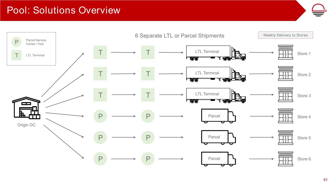 Pool: Solutions Overview 6 Separate LTL or Parcel Shipments Weekly Delivery to Stores Parcel Service P Center / Hub LTL Terminal Store 1 T LTL Terminal T T T T LTL Terminal Store 2 T T LTL Terminal Store 3 P P Parcel Store 4 Origin DC P P Parcel Store 5 P P Parcel Store 6 51