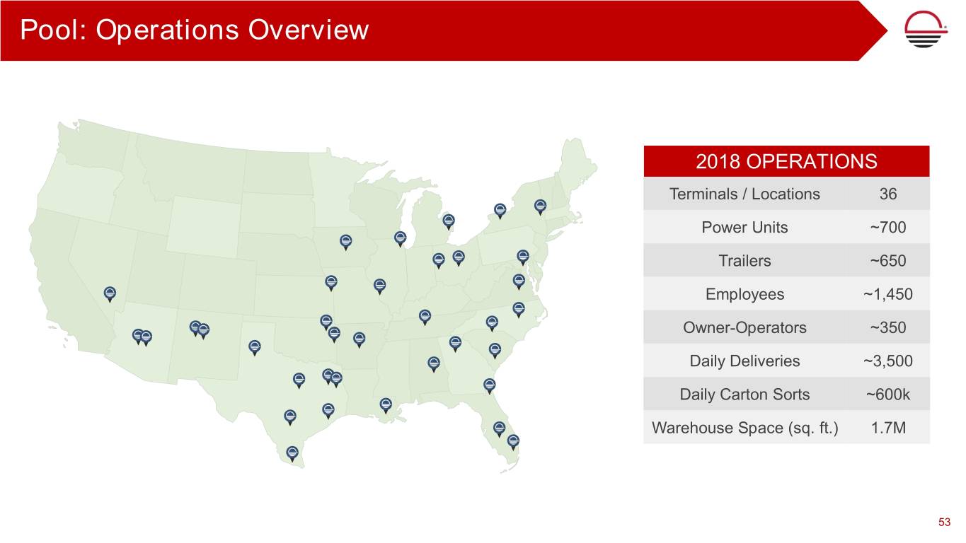 Pool: Operations Overview 2018 OPERATIONS Terminals / Locations 36 Power Units ~700 Trailers ~650 Employees ~1,450 Owner-Operators ~350 Daily Deliveries ~3,500 Daily Carton Sorts ~600k Warehouse Space (sq. ft.) 1.7M 53