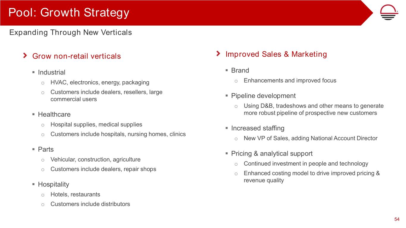 Pool: Growth Strategy Expanding Through New Verticals Grow non-retail verticals Improved Sales & Marketing . Industrial . Brand o HVAC, electronics, energy, packaging o Enhancements and improved focus o Customers include dealers, resellers, large commercial users . Pipeline development o Using D&B, tradeshows and other means to generate . Healthcare more robust pipeline of prospective new customers o Hospital supplies, medical supplies . Increased staffing o Customers include hospitals, nursing homes, clinics o New VP of Sales, adding National Account Director . Parts . Pricing & analytical support o Vehicular, construction, agriculture o Continued investment in people and technology o Customers include dealers, repair shops o Enhanced costing model to drive improved pricing & revenue quality . Hospitality o Hotels, restaurants o Customers include distributors 54