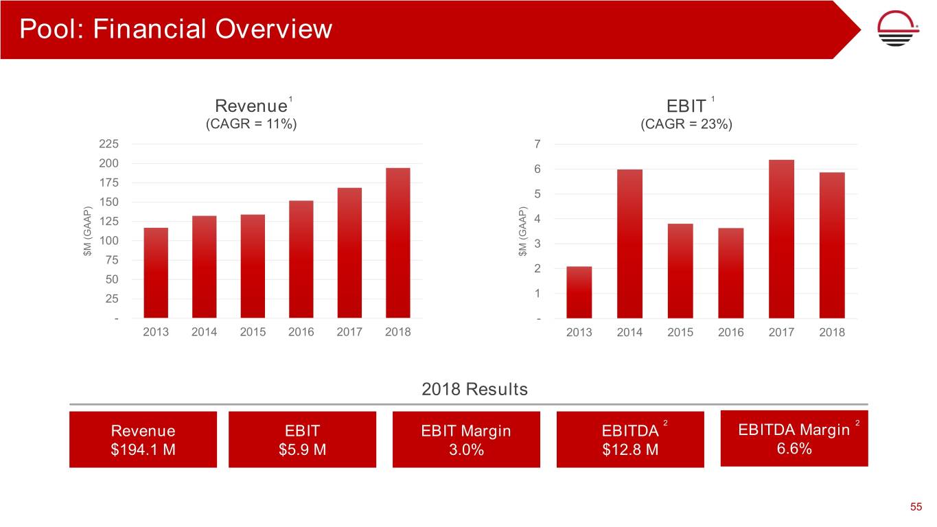 Pool: Financial Overview Revenue 1 EBIT 1 (CAGR = 11%) (CAGR = 23%) 225 7 200 6 175 5 150 125 4 100 3 $M $M (GAAP) 75 $M (GAAP) 2 50 25 1 - - 2013 2014 2015 2016 2017 2018 2013 2014 2015 2016 2017 2018 2018 Results 2 2 Revenue EBIT EBIT Margin EBITDA EBITDA Margin $194.1 M $5.9 M 3.0% $12.8 M 6.6% 55
