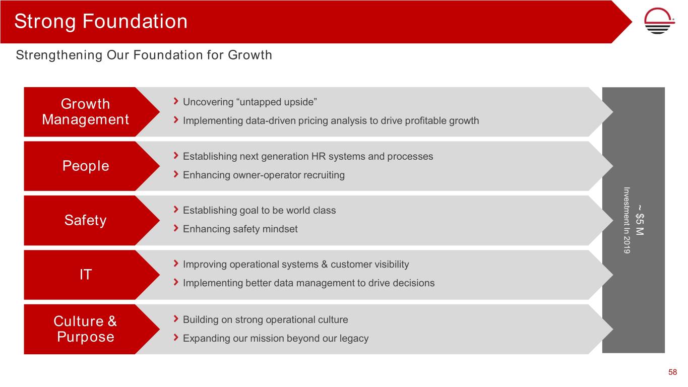 58 ~ $5 M Investment In 2019 driven pricing analysis to drive profitable growth profitable drive to analysis pricing driven - operator recruiting operator - Expanding our mission beyond our legacy our beyond mission our Expanding Enhancing safety mindset safety Enhancing visibility & customer systems operational Improving decisions drive to management data better Implementing culture operational strong on Building Implementing data Implementing processes and systems HR generation next Establishing owner Enhancing class world be to goal Establishing Uncovering “untapped upside” “untapped Uncovering IT Safety People Growth Purpose Culture & Culture Management Strengthening Our Foundation for Growth Our FoundationStrengthening Strong Foundation Strong