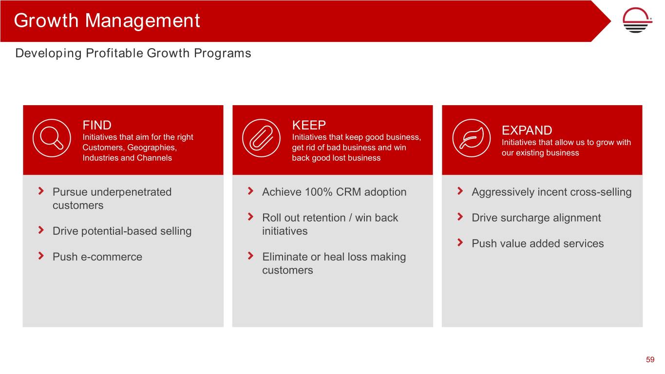 Growth Management Developing Profitable Growth Programs FIND KEEP EXPAND Initiatives that aim for the right Initiatives that keep good business, Initiatives that allow us to grow with Customers, Geographies, get rid of bad business and win our existing business Industries and Channels back good lost business Pursue underpenetrated Achieve 100% CRM adoption Aggressively incent cross-selling customers Roll out retention / win back Drive surcharge alignment Drive potential-based selling initiatives Push value added services Push e-commerce Eliminate or heal loss making customers 59