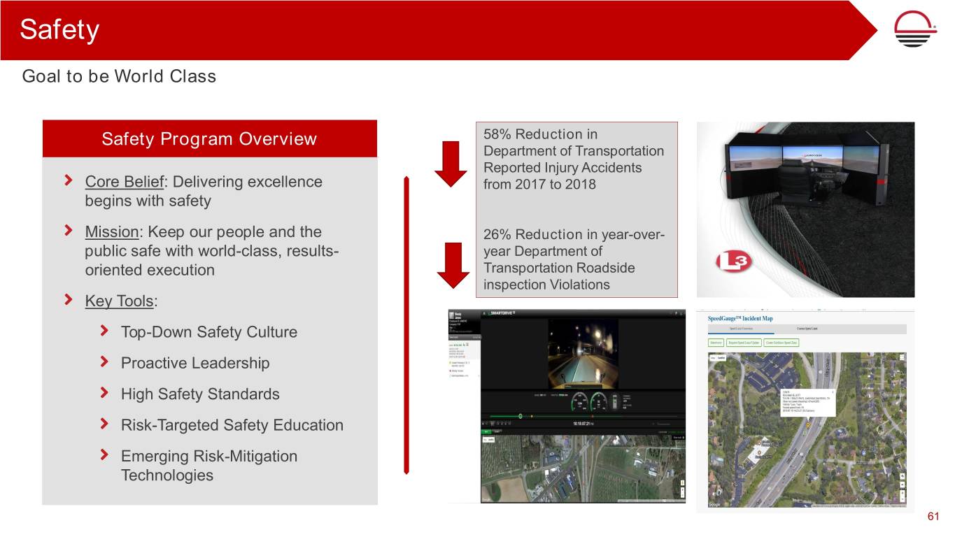 Safety Goal to be World Class Safety Program Overview 58% Reduction in Department of Transportation Reported Injury Accidents Core Belief: Delivering excellence from 2017 to 2018 begins with safety Mission: Keep our people and the 26% Reduction in year-over- public safe with world-class, results- year Department of oriented execution Transportation Roadside inspection Violations Key Tools: Recruiting video link Top-Down Safety Culture Proactive Leadership High Safety Standards Risk-Targeted Safety Education Emerging Risk-Mitigation Technologies 61
