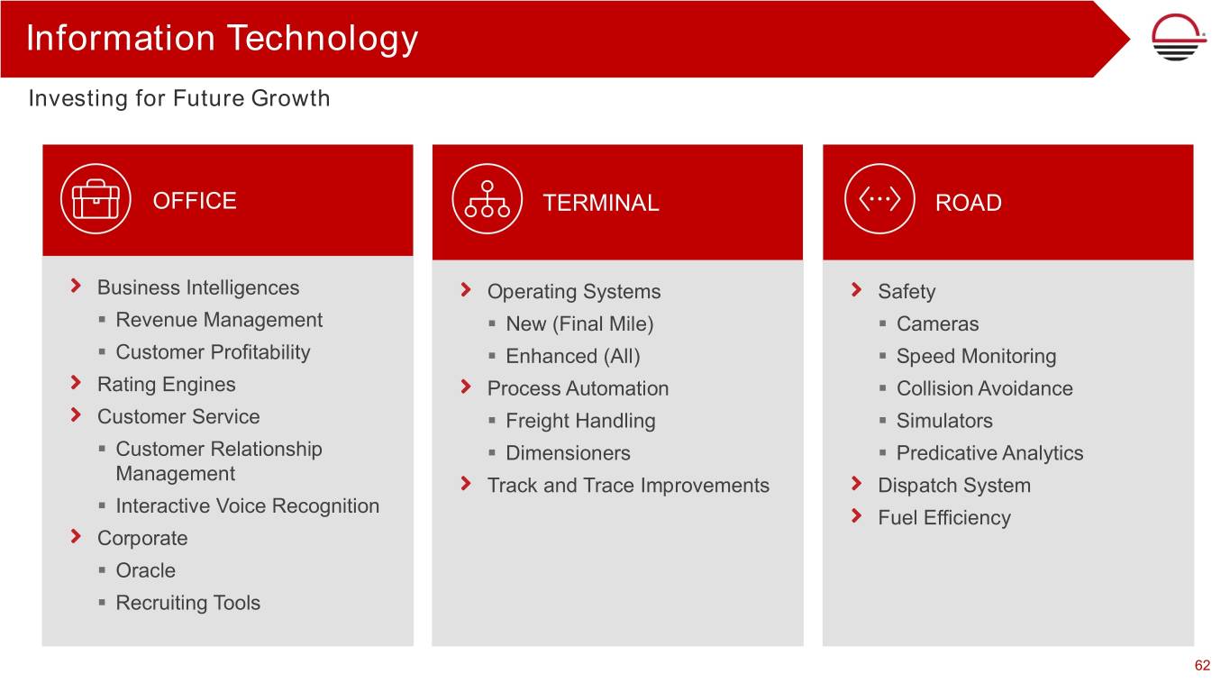 Information Technology Investing for Future Growth OFFICE TERMINAL ROAD Business Intelligences Operating Systems Safety . Revenue Management . New (Final Mile) . Cameras . Customer Profitability . Enhanced (All) . Speed Monitoring Rating Engines Process Automation . Collision Avoidance Customer Service . Freight Handling . Simulators . Customer Relationship . Dimensioners . Predicative Analytics Management Track and Trace Improvements Dispatch System . Interactive Voice Recognition Fuel Efficiency Corporate . Oracle . Recruiting Tools 62