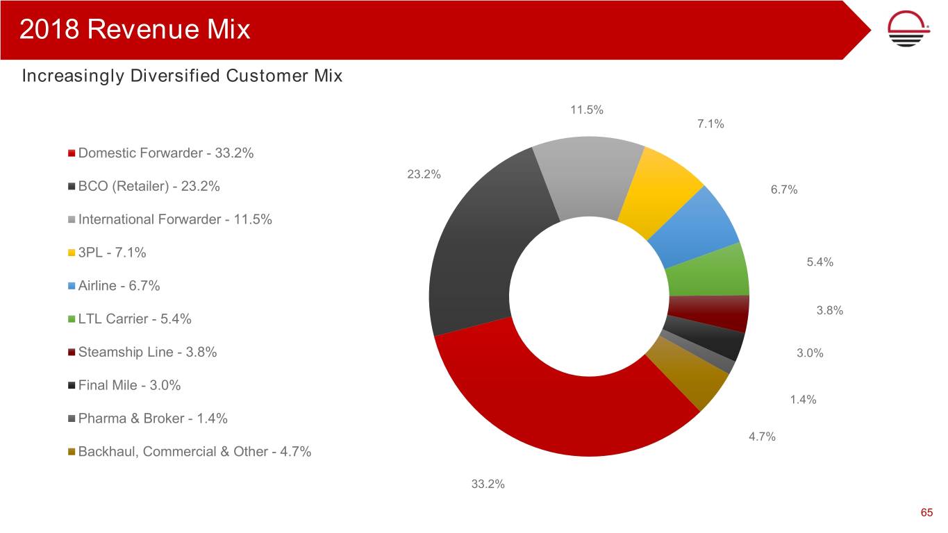 2018 Revenue Mix Increasingly Diversified Customer Mix 11.5% 7.1% Domestic Forwarder - 33.2% 23.2% BCO (Retailer) - 23.2% 6.7% International Forwarder - 11.5% 3PL - 7.1% 5.4% Airline - 6.7% 3.8% LTL Carrier - 5.4% Steamship Line - 3.8% 3.0% Final Mile - 3.0% 1.4% Pharma & Broker - 1.4% 4.7% Backhaul, Commercial & Other - 4.7% 33.2% 65