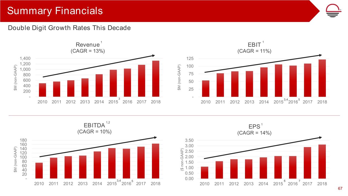 Summary Financials Double Digit Growth Rates This Decade 1 Revenue 1 EBIT (CAGR = 13%) (CAGR = 11%) 1,400 125 1,200 100 1,000 GAAP) GAAP) 75 800 - - 600 50 400 $M $M (non $M $M (non 200 25 - - 3 3,4 5 2010 2011 2012 2013 2014 2015 2016 2017 2018 2010 2011 2012 2013 2014 2015 2016 2017 2018 1,2 EBITDA EPS 1 (CAGR = 10%) (CAGR = 14%) 180 3.50 160 3.00 140 ) 120 2.50 GAAP) - 2.00 100 GAAP 80 - 1.50 60 1.00 ($non $M $M (non 40 20 0.50 - 0.00 3,4 5 6 7 2010 2011 2012 2013 2014 2015 2016 2017 2018 2010 2011 2012 2013 2014 2015 2016 2017 2018 67