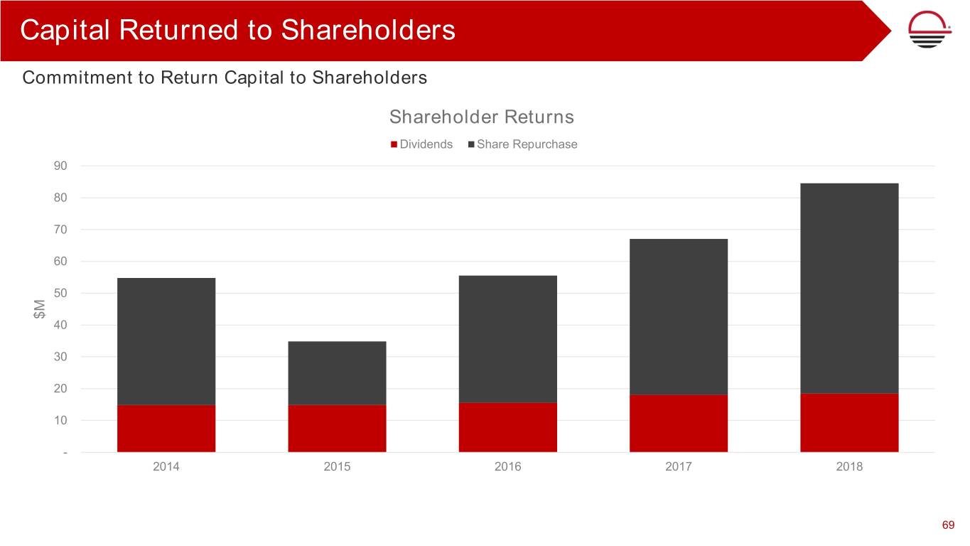 Capital Returned to Shareholders Commitment to Return Capital to Shareholders Shareholder Returns Dividends Share Repurchase 90 80 70 60 50 $M 40 30 20 10 - 2014 2015 2016 2017 2018 69