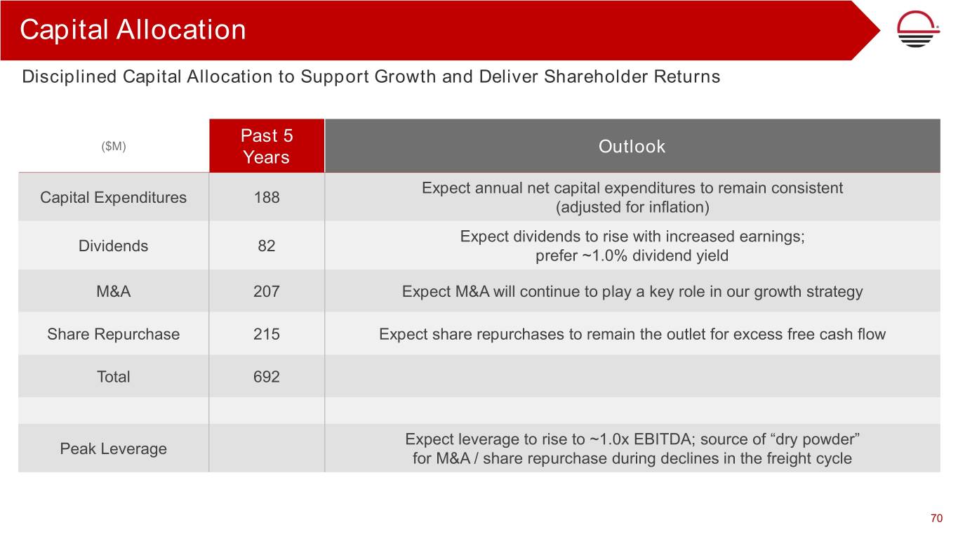 Capital Allocation Disciplined Capital Allocation to Support Growth and Deliver Shareholder Returns Past 5 ($M) Outlook Years Expect annual net capital expenditures to remain consistent Capital Expenditures 188 (adjusted for inflation) Expect dividends to rise with increased earnings; Dividends 82 prefer ~1.0% dividend yield M&A 207 Expect M&A will continue to play a key role in our growth strategy Share Repurchase 215 Expect share repurchases to remain the outlet for excess free cash flow Total 692 Expect leverage to rise to ~1.0x EBITDA; source of “dry powder” Peak Leverage for M&A / share repurchase during declines in the freight cycle 70