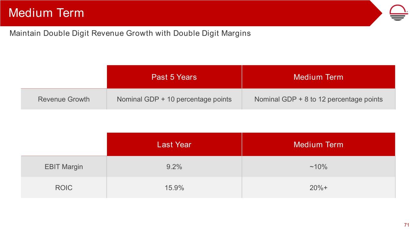Medium Term Maintain Double Digit Revenue Growth with Double Digit Margins Past 5 Years Medium Term Revenue Growth Nominal GDP + 10 percentage points Nominal GDP + 8 to 12 percentage points Last Year Medium Term EBIT Margin 9.2% ~10% ROIC 15.9% 20%+ 71