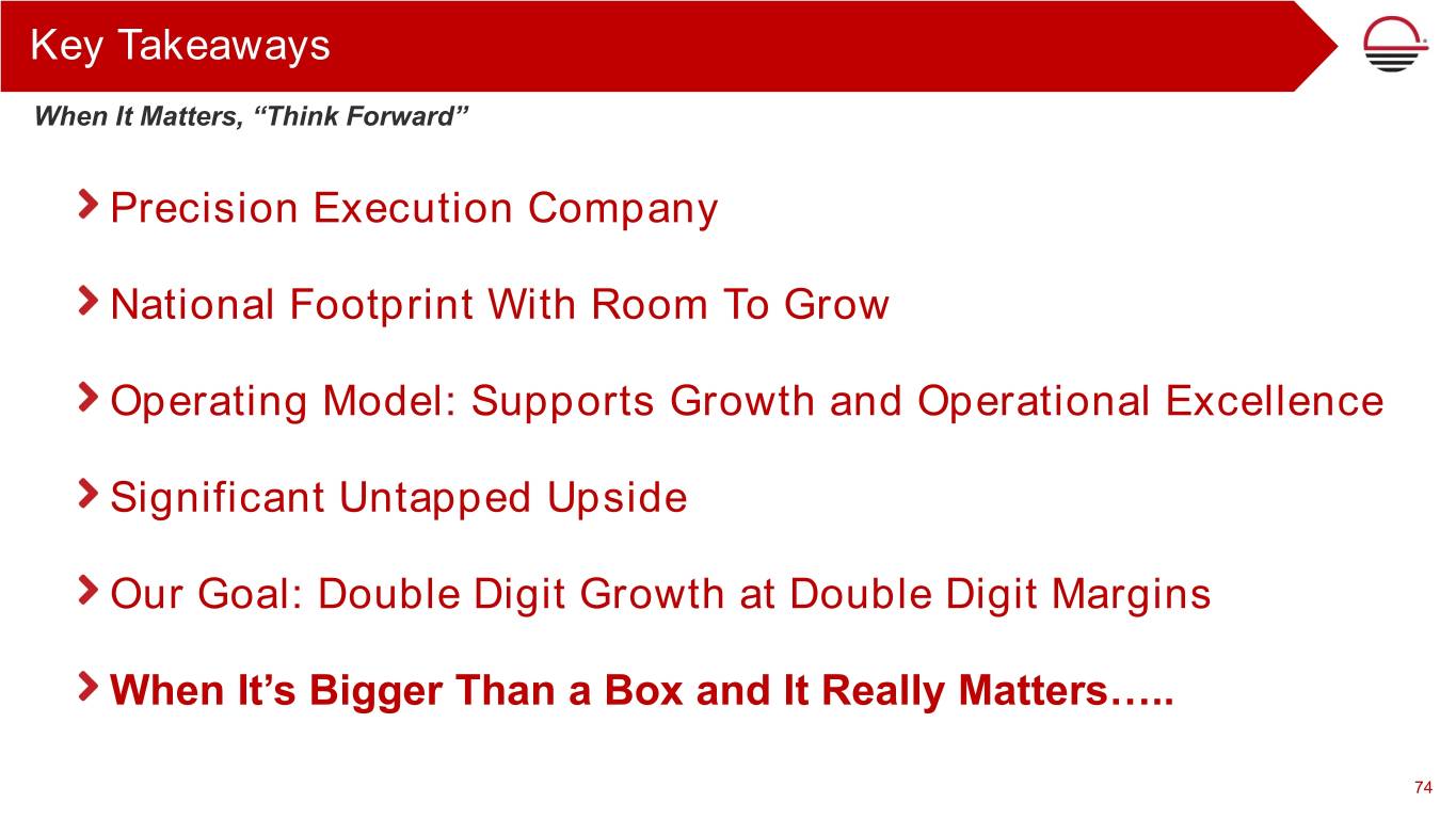 Key Takeaways When It Matters, “Think Forward” Precision Execution Company National Footprint With Room To Grow Operating Model: Supports Growth and Operational Excellence Significant Untapped Upside Our Goal: Double Digit Growth at Double Digit Margins When It’s Bigger Than a Box and It Really Matters….. 74