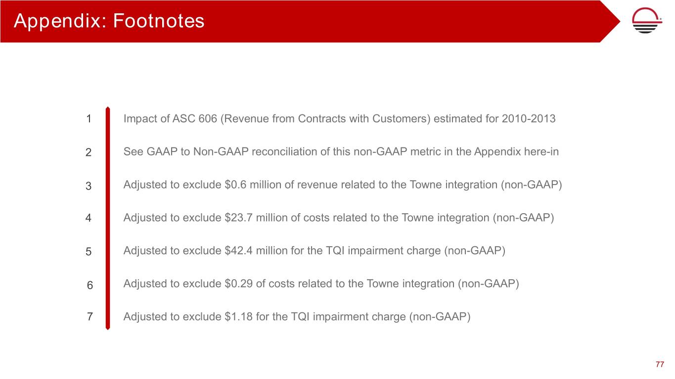 Appendix: Footnotes 1 Impact of ASC 606 (Revenue from Contracts with Customers) estimated for 2010-2013 2 See GAAP to Non-GAAP reconciliation of this non-GAAP metric in the Appendix here-in 3 Adjusted to exclude $0.6 million of revenue related to the Towne integration (non-GAAP) 4 Adjusted to exclude $23.7 million of costs related to the Towne integration (non-GAAP) 5 Adjusted to exclude $42.4 million for the TQI impairment charge (non-GAAP) 6 Adjusted to exclude $0.29 of costs related to the Towne integration (non-GAAP) 7 Adjusted to exclude $1.18 for the TQI impairment charge (non-GAAP) 77