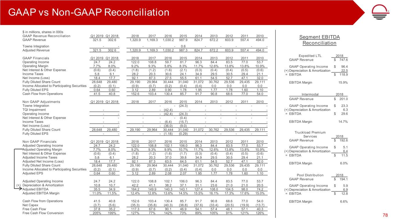 GAAP vs Non-GAAP Reconciliation $ in millions, shares in 000s GAAP Revenue Reconciliation Q1 2019 Q1 2018 2018 2017 2016 2015 2014 2013 2012 2011 2010 Segment EBITDA GAAP Revenue 321.5 302.6 1,320.9 1,169.3 1,030.2 987.9 824.7 672.2 603.9 557.4 494.0 Reconciliation Towne Integration - - - - - 0.6 - - - - - Adjusted Revenue 321.5 302.6 1,320.9 1,169.3 1,030.2 987.3 824.7 672.2 603.9 557.4 494.0 Expedited LTL 2018 GAAP Financials Q1 2019 Q1 2018 2018 2017 2016 2015 2014 2013 2012 2011 2010 GAAP Revenue $ 747.6 Operating Income 24.7 24.2 122.0 108.8 59.7 81.7 96.3 84.4 83.5 77.0 53.7 Operating Margin 7.7% 8.0% 9.2% 9.3% 5.8% 8.3% 11.7% 12.6% 13.8% 13.8% 10.9% GAAP Operating Income $ 96.4 Net Interest & Other Expense (0.6) (0.4) (1.8) (1.2) (1.6) (2.1) (0.3) (0.4) (0.4) (0.5) (0.6) (+) Depreciation & Amortization 22.5 Income Taxes 5.8 6.1 28.2 20.3 30.6 24.1 34.9 29.5 30.5 29.4 21.1 = EBITDA $ 118.9 Net Income (Loss) 18.4 17.7 92.1 87.3 27.5 55.5 61.1 54.5 52.7 47.1 32.0 Fully Diluted Share Count 28,648 29,480 29,190 29,964 30,444 31,040 31,072 30,762 29,536 29,435 29,111 EBITDA Margin 15.9% Income Allocated to Participating Securities (0.2) (0.1) (0.9) (0.7) (0.2) (0.4) (0.4) 0.0 0.0 0.0 0.0 Fully Diluted EPS 0.64 0.60 3.12 2.89 0.90 1.78 1.95 1.77 1.78 1.60 1.10 Cash Flow from Operations 41.5 40.8 152.6 103.4 130.4 85.7 91.7 90.8 68.6 77.0 54.0 Intermodal 2018 GAAP Revenue $ 201.0 Non GAAP Adjustments Q1 2019 Q1 2018 2018 2017 2016 2015 2014 2013 2012 2011 2010 Towne Integration - - (24.3) - - - - - GAAP Operating Income $ 23.3 TQI Impairment - - (42.4) - - - - - - (+) Depreciation & Amortization 6.3 Operating Income - - - - (42.4) (24.3) - - - - - = EBITDA $ 29.6 Net Interest & Other Expense - - - - - (0.4) - - - - - Income Taxes - - - - (6.4) (15.7) - - - - - EBITDA Margin 14.7% Net Income (Loss) - - - - (36.0) (9.0) - - - - - Fully Diluted Share Count 28,648 29,480 29,190 29,964 30,444 31,040 31,072 30,762 29,536 29,435 29,111 Fully Diluted EPS - - - - (1.18) (0.29) - - - - - Truckload Premium Services 2018 Non GAAP Financials Q1 2019 Q1 2018 2018 2017 2016 2015 2014 2013 2012 2011 2010 GAAP Revenue $ 192.6 Adjusted Operating Income 24.7 24.2 122.0 108.8 102.1 106.0 96.3 84.4 83.5 77.0 53.7 GAAP Operating Income $ 5.1 Adjusted Operating Margin 7.7% 8.0% 9.2% 9.3% 9.9% 10.7% 11.7% 12.6% 13.8% 13.8% 10.9% (+) Depreciation & Amortization 6.4 Net Interest & Other Expense (0.6) (0.4) (1.8) (1.2) (1.6) (1.7) (0.3) (0.4) (0.4) (0.5) (0.6) = EBITDA $ 11.5 Adjusted Income Taxes 5.8 6.1 28.2 20.3 37.0 39.8 34.9 29.5 30.5 29.4 21.1 Adjusted Net Income (Loss) 18.4 17.7 92.1 87.3 63.5 64.5 61.1 54.5 52.7 47.1 32.0 EBITDA Margin 6.0% Fully Diluted Share Count 28,648 29,480 29,190 29,964 30,444 31,040 31,072 30,762 29,536 29,435 29,111 Income Allocated to Participating Securities (0.2) (0.1) (0.9) (0.7) (0.2) (0.4) (0.4) 0.0 0.0 0.0 0.0 Adjusted EPS 0.64 0.60 3.12 2.89 2.08 2.07 1.95 1.77 1.78 1.60 1.10 Pool Distribution 2018 GAAP Revenue $ 194.1 Adjusted Operating Income 24.7 24.2 122.0 108.8 102.1 106.0 96.3 84.4 83.5 77.0 53.7 (+) Depreciation & Amortization 10.8 10.7 42.2 41.1 38.2 37.1 31.1 23.6 21.0 21.0 20.5 GAAP Operating Income $ 5.9 Adjusted EBITDA 35.5 34.9 164.2 149.9 140.3 143.1 127.4 108.0 104.5 98.0 74.2 (+) Depreciation & Amortization 6.9 Adjusted EBITDA Margin 11.0% 11.5% 12.4% 12.8% 13.6% 14.5% 15.5% 16.1% 17.3% 17.6% 15.0% = EBITDA $ 12.8 Cash Flow from Operations 41.5 40.8 152.6 103.4 130.4 85.7 91.7 90.8 68.6 77.0 54.0 EBITDA Margin 6.6% Net Capex (3.7) (5.6) (35.3) (35.8) (40.3) (38.8) (37.6) (33.4) (20.5) (19.9) (13.7) Free Cash Flow 37.8 35.2 117.3 67.6 90.1 46.9 54.1 57.4 48.1 57.1 40.3 Free Cash Flow Conversion 205% 199% 127% 77% 142% 73% 89% 105% 91% 121% 126% 78