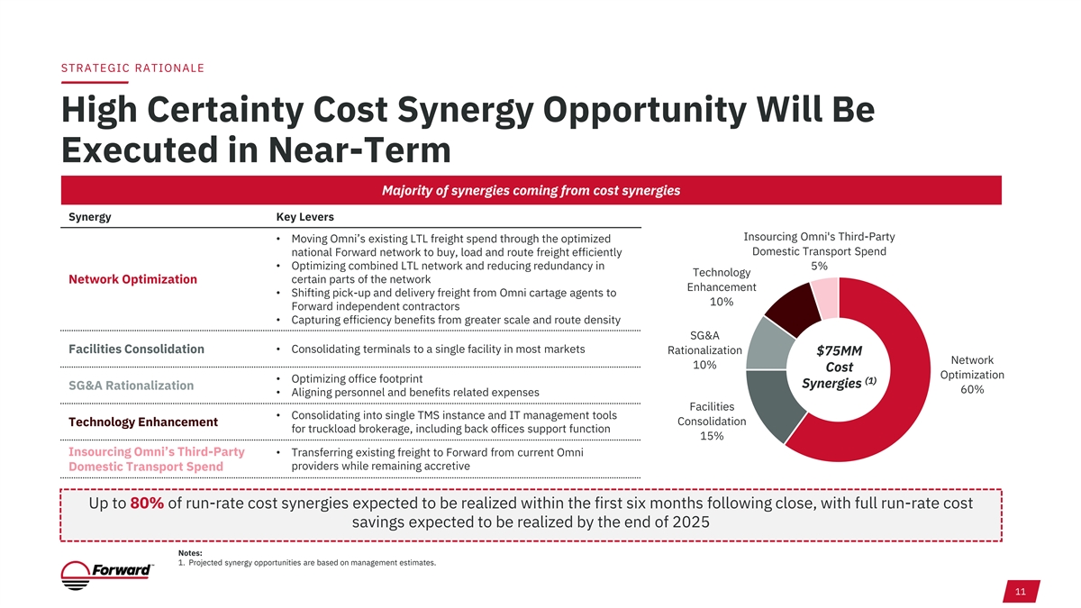 STRATEGIC RATIONALE Omni Will Drive Volumes and Margin to Forward’s Expedited LTL Network • Expands Expedited Fright Customer Base − Forward and Omni complement each other and will be able to provide customers cost savings on moving high quality, time sensitive freight − ~35% of Omni’s business is LTL, remainder is focused on bringing high-value goods into and throughout the U.S. • Enhances Platform Scale and Margin (1) − Forward current scale to double, with Adj. Revenues of ~$3.7B for twelve months ended June 30, 2023 − Combination removes an organization’s gross margin between shipper and destination − Omni originated LTL moved by Forward will be margin enhancing for Forward, allowing Forward to capture both wholesale and retail margin on the same revenue. EBITDA margin on such moves is expected to be greater than 20% • Broader Service Offering Will Drive Incremental Business into the Forward LTL Network − Complementary services support the long-term growth of Forward’s Expedited LTL business − Omni’s domestic business generates significant LTL freight volumes which can be moved onto Forward network − Omni’s international freight transportation services move high value freight to North America that will feed the Forward network • Combines Industry – Leading Teams − Acquisition allows Forward to go directly to shippers while maintaining and growing with our historic wholesale customers − Positions Forward for long term growth of the business model by expanding the customer base to include shippers, 3PL, forwarders and airlines − Omni’s retail salesforce sells significant amount of high value LTL freight (which is often fulfilled by Forward) and as such already has a strong understanding of the combined footprint and service capabilities to market the combined offering − Strong commercial engine enables pro-active cross sell revenue synergies in LTL along with complementary Omni services − Adds deep retail sales expertise to an already strong wholesale sales and account management team − To drive growth in both the wholesale and retail markets, Forward will go to market with two sales organizations with channel expertise • Expands Geographic Footprint and Capacity − Combined company will have 300+ locations, creating a network flywheel for customers through the addition of Omni’s 40+ strategically located terminals across the United States − Addition of Omni’s presence in Europe, Asia, and South America is expected to expand Forward’s international capabilities and allow Forward to provide extended logistics services support for global customers Notes: 1. Represents a non-GAAP figure. Please see appendix for a non-GAAP reconciliation. Assumes full realization of expected synergy opportunities, based on management estimates. Synergy opportunities are exclusive of one- time costs necessary to achieve such synergies, estimated to be approximately $36MM. Estimated revenue-based EBITDA synergy opportunities have been converted into EBITDA estimates assuming the full realization of 10 the revenue synergy opportunities, based on an assumed margin percentage of 21%. This assumed margin percentage is based on management’s estimates and an analysis of incremental margin by revenue segment.