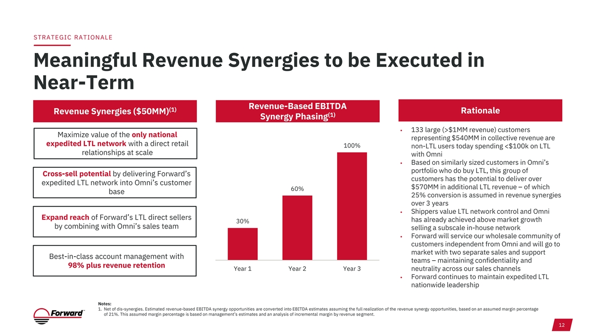 STRATEGIC RATIONALE High Certainty Cost Synergy Opportunity Will Be Executed in Near-Term Majority of synergies coming from cost synergies Synergy Key Levers Insourcing Omni's Third-Party • Moving Omni’s existing LTL freight spend through the optimized Domestic Transport Spend national Forward network to buy, load and route freight efficiently • Optimizing combined LTL network and reducing redundancy in 5% Technology Network Optimization certain parts of the network Enhancement • Shifting pick-up and delivery freight from Omni cartage agents to 10% Forward independent contractors • Capturing efficiency benefits from greater scale and route density SG&A Facilities Consolidation • Consolidating terminals to a single facility in most markets Rationalization $75MM Network 10% Cost Optimization • Optimizing office footprint (1) Synergies SG&A Rationalization 60% • Aligning personnel and benefits related expenses Facilities • Consolidating into single TMS instance and IT management tools Consolidation Technology Enhancement for truckload brokerage, including back offices support function 15% Insourcing Omni’s Third-Party • Transferring existing freight to Forward from current Omni providers while remaining accretive Domestic Transport Spend Up to 80% of run-rate cost synergies expected to be realized within the first six months following close, with full run-rate cost savings expected to be realized by the end of 2025 Notes: 1. Projected synergy opportunities are based on management estimates. 11