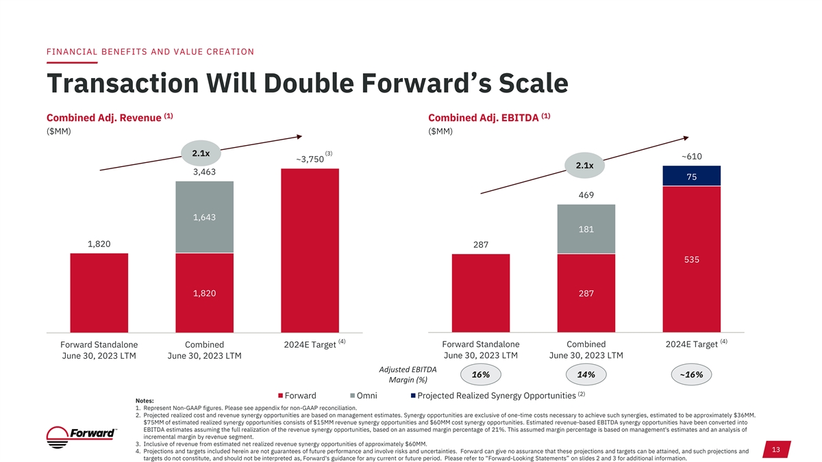 STRATEGIC RATIONALE Meaningful Revenue Synergies to be Executed in Near-Term Revenue-Based EBITDA (1) Rationale Revenue Synergies ($50MM) (1) Synergy Phasing • 133 large (>$1MM revenue) customers Maximize value of the only national representing $540MM in collective revenue are expedited LTL network with a direct retail 100% non-LTL users today spending <$100k on LTL relationships at scale with Omni • Based on similarly sized customers in Omni’s portfolio who do buy LTL, this group of Cross-sell potential by delivering Forward’s customers has the potential to deliver over expedited LTL network into Omni’s customer $570MM in additional LTL revenue – of which 60% base 25% conversion is assumed in revenue synergies over 3 years • Shippers value LTL network control and Omni Expand reach of Forward’s LTL direct sellers has already achieved above market growth 30% by combining with Omni’s sales team selling a subscale in-house network • Forward will service our wholesale community of customers independent from Omni and will go to market with two separate sales and support Best-in-class account management with teams – maintaining confidentiality and 98% plus revenue retention Year 1 Year 2 Year 3 neutrality across our sales channels • Forward continues to maintain expedited LTL nationwide leadership Notes: 1. Net of dis-synergies. Estimated revenue-based EBITDA synergy opportunities are converted into EBITDA estimates assuming the full realization of the revenue synergy opportunities, based on an assumed margin percentage of 21%. This assumed margin percentage is based on management’s estimates and an analysis of incremental margin by revenue segment. 12
