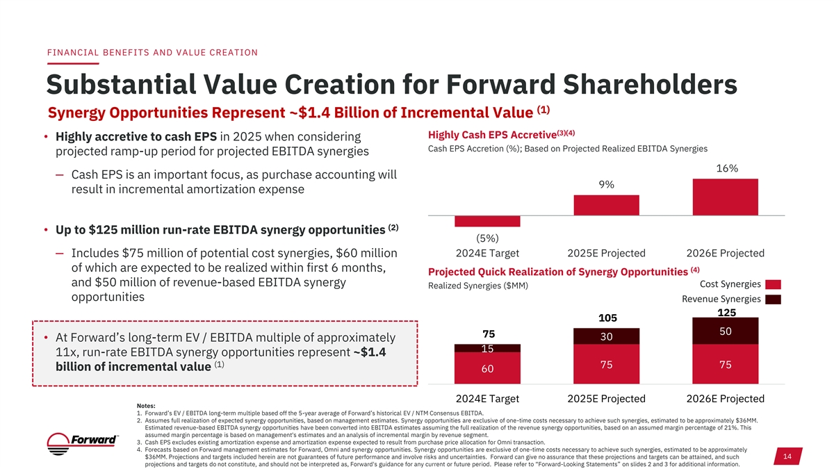 FINANCIAL BENEFITS AND VALUE CREATION Transaction Will Double Forward’s Scale (1) (1) Combined Adj. Revenue Combined Adj. EBITDA ($MM) ($MM) (3) 2.1x ~610 ~3,750 2.1x 3,463 75 469 1,643 181 1,820 287 535 1,820 287 (4) (4) Forward Standalone Combined 2024E Target Forward Standalone Combined 2024E Target June 30, 2023 LTM June 30, 2023 LTM June 30, 2023 LTM June 30, 2023 LTM Adjusted EBITDA 16% 14% ~16% Margin (%) (2) Forward Omni Projected Realized Synergy Opportunities Notes: 1. Represent Non-GAAP figures. Please see appendix for non-GAAP reconciliation. 2. Projected realized cost and revenue synergy opportunities are based on management estimates. Synergy opportunities are exclusive of one-time costs necessary to achieve such synergies, estimated to be approximately $36MM. $75MM of estimated realized synergy opportunities consists of $15MM revenue synergy opportunities and $60MM cost synergy opportunities. Estimated revenue-based EBITDA synergy opportunities have been converted into EBITDA estimates assuming the full realization of the revenue synergy opportunities, based on an assumed margin percentage of 21%. This assumed margin percentage is based on management's estimates and an analysis of incremental margin by revenue segment. 3. Inclusive of revenue from estimated net realized revenue synergy opportunities of approximately $60MM. 13 4. Projections and targets included herein are not guarantees of future performance and involve risks and uncertainties. Forward can give no assurance that these projections and targets can be attained, and such projections and targets do not constitute, and should not be interpreted as, Forward's guidance for any current or future period. Please refer to “Forward-Looking Statements” on slides 2 and 3 for additional information.