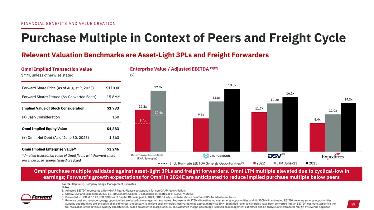 FINANCIAL BENEFITS AND VALUE CREATION Substantial Value Creation for Forward Shareholders (1) Synergy Opportunities Represent ~$1.4 Billion of Incremental Value (3)(4) Highly Cash EPS Accretive • Highly accretive to cash EPS in 2025 when considering Cash EPS Accretion (%); Based on Projected Realized EBITDA Synergies projected ramp-up period for projected EBITDA synergies 16% ‒ Cash EPS is an important focus, as purchase accounting will 9% result in incremental amortization expense (2) • Up to $125 million run-rate EBITDA synergy opportunities (5%) ‒ Includes $75 million of potential cost synergies, $60 million 2024E Target 2025E Projected 2026E Projected of which are expected to be realized within first 6 months, (4) Projected Quick Realization of Synergy Opportunities and $50 million of revenue-based EBITDA synergy Cost Synergies Realized Synergies ($MM) opportunities Revenue Synergies 125 105 50 75 30 • At Forward’s long-term EV / EBITDA multiple of approximately 15 11x, run-rate EBITDA synergy opportunities represent ~$1.4 (1) 75 75 billion of incremental value 60 2024E Target 2025E Projected 2026E Projected Notes: 1. Forward’s EV / EBITDA long-term multiple based off the 5-year average of Forward’s historical EV / NTM Consensus EBITDA. 2. Assumes full realization of expected synergy opportunities, based on management estimates. Synergy opportunities are exclusive of one-time costs necessary to achieve such synergies, estimated to be approximately $36MM. Estimated revenue-based EBITDA synergy opportunities have been converted into EBITDA estimates assuming the full realization of the revenue synergy opportunities, based on an assumed margin percentage of 21%. This assumed margin percentage is based on management's estimates and an analysis of incremental margin by revenue segment. 3. Cash EPS excludes existing amortization expense and amortization expense expected to result from purchase price allocation for Omni transaction. 4. Forecasts based on Forward management estimates for Forward, Omni and synergy opportunities. Synergy opportunities are exclusive of one-time costs necessary to achieve such synergies, estimated to be approximately 14 $36MM. Projections and targets included herein are not guarantees of future performance and involve risks and uncertainties. Forward can give no assurance that these projections and targets can be attained, and such projections and targets do not constitute, and should not be interpreted as, Forward's guidance for any current or future period. Please refer to “Forward-Looking Statements” on slides 2 and 3 for additional information.