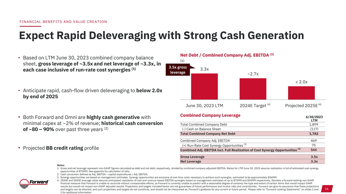 FINANCIAL BENEFITS AND VALUE CREATION Purchase Multiple in Context of Peers and Freight Cycle Relevant Valuation Benchmarks are Asset-Light 3PLs and Freight Forwarders (1)(2) Omni Implied Transaction Value Enterprise Value / Adjusted EBITDA $MM, unless otherwise stated (x) 18.5x 17.9x Forward Share Price (As of August 9, 2023) $110.00 16.1x Forward Shares Issued (As-Converted Basis) 15.8MM 14.8x 14.2x 14.3x 12.3x Implied Value of Stock Consideration $1,733 11.7x 11.0x 10.6x 9.8x (+) Cash Consideration 150 8.4x 8.4x Omni Implied Equity Value $1,883 (+) Omni Net Debt (As of June 30, 2023) 1,363 Omni Implied Enterprise Value* $3,246 (3) Omni Transaction Multiple * Implied transaction value of Omni floats with Forward share (Excl. Synergies) price, because shares issued are fixed (4) Incl. Run-rate EBITDA Synergy Opportunities 2022 LTM June-23 2023 Omni purchase multiple validated against asset-light 3PLs and freight forwarders. Omni LTM multiple elevated due to cyclical-low in earnings; Forward’s growth expectations for Omni in 2024E are anticipated to reduce implied purchase multiple below peers Source: Capital IQ, Company Filings, Management Estimates Notes: 1. Adjusted EBITDA represents a Non-GAAP figure. Please see appendix for non-GAAP reconciliation. 2. CHRW, DSV and Expeditors 2023E EBITDA reflects Capital IQ consensus estimates as of August 9, 2023. 3. Converted to USD at 0.147 USD / DKK as of Capital IQ on August 9, 2023; EBITDA adjusted to be shown on a Pre-IFRS-16 adjustment basis. 4. Run-rate cost and revenue synergy opportunities are based on management estimates. Represents (i) $75MM in estimated cost synergy opportunities and (ii) $50MM in estimated EBITDA revenue synergy opportunities. Synergy opportunities are exclusive of one-time costs necessary to achieve such synergies, estimated to be approximately $36MM. Identified revenue synergies have been converted into an EBITDA estimate, assuming the 15 full realization of the revenue synergy opportunities, based on assumed margin of 21%. This assumed margin percentage is based on management estimates and an analysis of incremental margin by revenue segment.