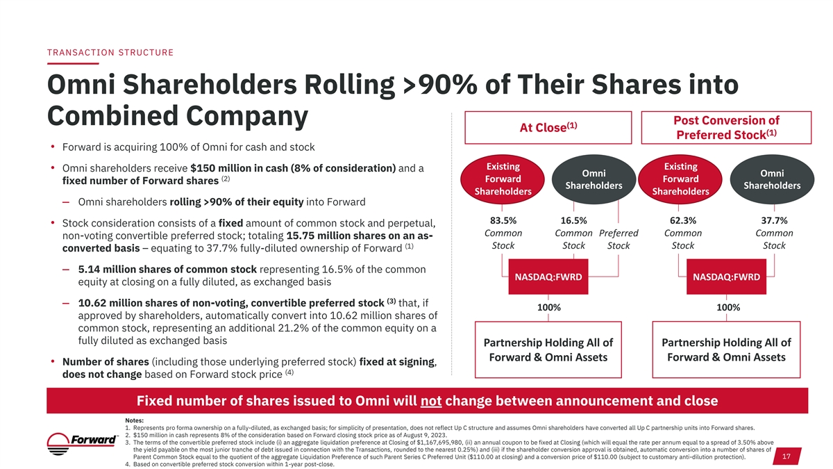 FINANCIAL BENEFITS AND VALUE CREATION Expect Rapid Deleveraging with Strong Cash Generation (1) Net Debt / Combined Company Adj. EBITDA • Based on LTM June 30, 2023 combined company balance (x) sheet, gross leverage of ~3.5x and net leverage of ~3.3x, in 3.5x gross (1) 3.3x each case inclusive of run-rate cost synergies leverage ~2.7x < 2.0x • Anticipate rapid, cash-flow driven deleveraging to below 2.0x by end of 2025 (4) (4) June 30, 2023 LTM 2024E Target Projected 2025E Combined Company Leverage 6/30/2023 • Both Forward and Omni are highly cash generative with LTM minimal capex at ~2% of revenue; historical cash conversion Total Combined Company Debt 1,899 (2) (-) Cash on Balance Sheet (117) of ~80 – 90% over past three years Total Combined Company Net Debt 1,782 Combined Company Adj. EBITDA 469 (3) (+) Run-Rate Cost Synergy Opportunities 75 • Projected BB credit rating profile (3) Combined Adj. EBITDA incl. Full Realization of Cost Synergy Opportunities 544 Gross Leverage 3.5x Net Leverage 3.3x Notes: 1. Gross and net leverage represent non-GAAP figures calculated as debt and net debt, respectively, divided by combined company adjusted EBITDA. Ratios for LTM June 30, 2023 assume realization in full of estimated cost synergy opportunities of $75MM. See appendix for calculation of ratio. 2. Cash conversion defined as Adj. EBITDA – capital expenditures / Adj. EBITDA. 3. Synergy opportunities are based on management estimates. Synergy opportunities are exclusive of one-time costs necessary to achieve such synergies, estimated to be approximately $36MM. 4. 2024E and 2025E leverage ratios assume anticipated realization of cost and revenue-based EBITDA synergies based on management estimates of up to $75MM and $50MM respectively. Denotes a forward-looking non-GAAP financial measure that Forward is unable to reconcile without unreasonable efforts, as Forward is currently unable to predict with a reasonable degree of certainty the type and extent of certain items that would impact GAAP results but would not impact non-GAAP adjusted results. Projections and targets included herein are not guarantees of future performance and involve risks and uncertainties. Forward can give no assurance that these projections 16 and targets can be attained, and such projections and targets do not constitute, and should not be interpreted as, Forward's guidance for any current or future period. Please refer to “Forward-Looking Statements” on slides 2 and 3 for additional information.