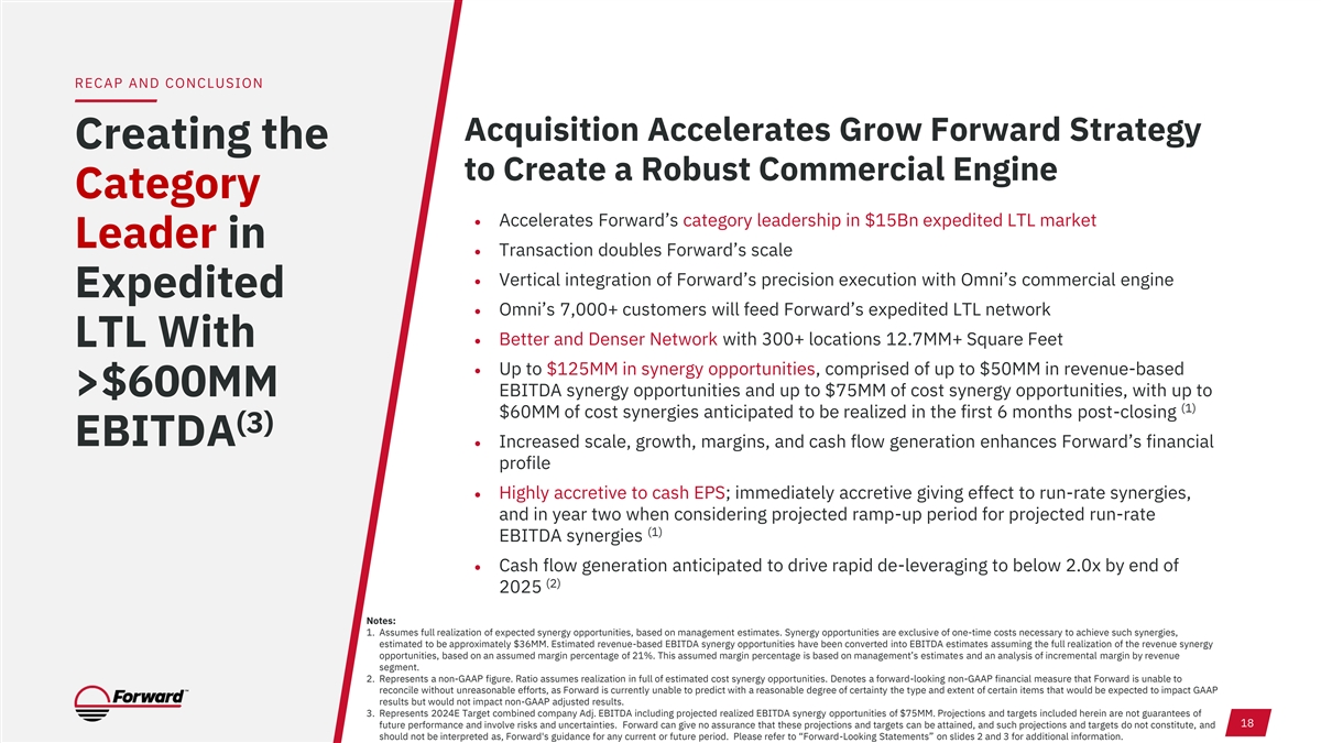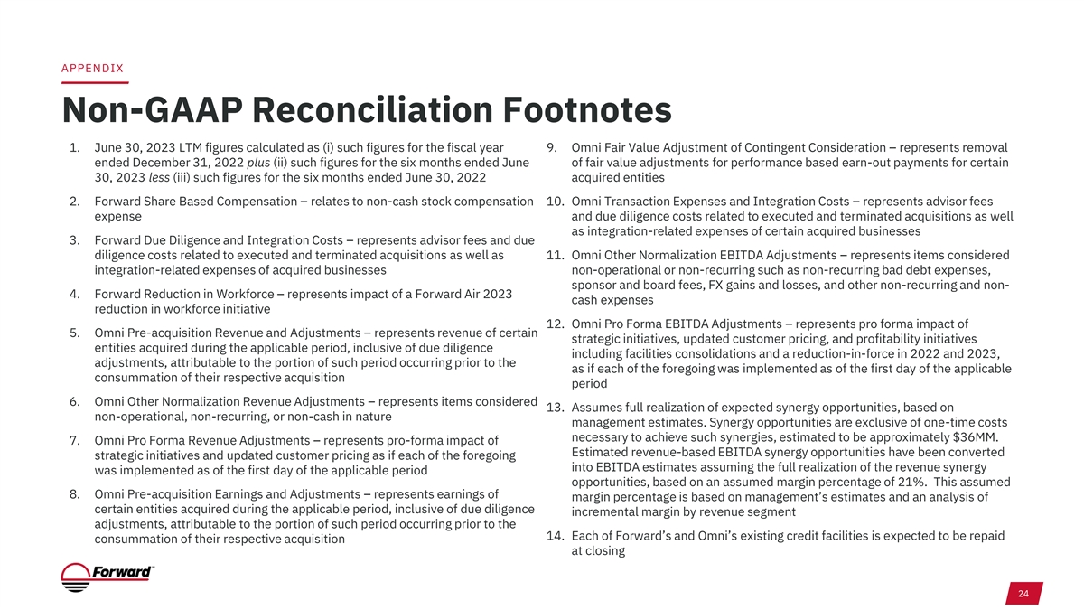 APPENDIX Non-GAAP Reconciliation Footnotes 1. June 30, 2023 LTM figures calculated as (i) such figures for the fiscal year 9. Omni Fair Value Adjustment of Contingent Consideration – represents removal ended December 31, 2022 plus (ii) such figures for the six months ended June of fair value adjustments for performance based earn-out payments for certain 30, 2023 less (iii) such figures for the six months ended June 30, 2022 acquired entities 2. Forward Share Based Compensation – relates to non-cash stock compensation 10. Omni Transaction Expenses and Integration Costs – represents advisor fees expense and due diligence costs related to executed and terminated acquisitions as well as integration-related expenses of certain acquired businesses 3. Forward Due Diligence and Integration Costs – represents advisor fees and due diligence costs related to executed and terminated acquisitions as well as 11. Omni Other Normalization EBITDA Adjustments – represents items considered integration-related expenses of acquired businesses non-operational or non-recurring such as non-recurring bad debt expenses, sponsor and board fees, FX gains and losses, and other non-recurring and non- 4. Forward Reduction in Workforce – represents impact of a Forward Air 2023 cash expenses reduction in workforce initiative 12. Omni Pro Forma EBITDA Adjustments – represents pro forma impact of 5. Omni Pre-acquisition Revenue and Adjustments – represents revenue of certain strategic initiatives, updated customer pricing, and profitability initiatives entities acquired during the applicable period, inclusive of due diligence including facilities consolidations and a reduction-in-force in 2022 and 2023, adjustments, attributable to the portion of such period occurring prior to the as if each of the foregoing was implemented as of the first day of the applicable consummation of their respective acquisition period 6. Omni Other Normalization Revenue Adjustments – represents items considered 13. Assumes full realization of expected synergy opportunities, based on non-operational, non-recurring, or non-cash in nature management estimates. Synergy opportunities are exclusive of one-time costs necessary to achieve such synergies, estimated to be approximately $36MM. 7. Omni Pro Forma Revenue Adjustments – represents pro-forma impact of Estimated revenue-based EBITDA synergy opportunities have been converted strategic initiatives and updated customer pricing as if each of the foregoing into EBITDA estimates assuming the full realization of the revenue synergy was implemented as of the first day of the applicable period opportunities, based on an assumed margin percentage of 21%. This assumed 8. Omni Pre-acquisition Earnings and Adjustments – represents earnings of margin percentage is based on management’s estimates and an analysis of certain entities acquired during the applicable period, inclusive of due diligence incremental margin by revenue segment adjustments, attributable to the portion of such period occurring prior to the 14. Each of Forward’s and Omni’s existing credit facilities is expected to be repaid consummation of their respective acquisition at closing 24