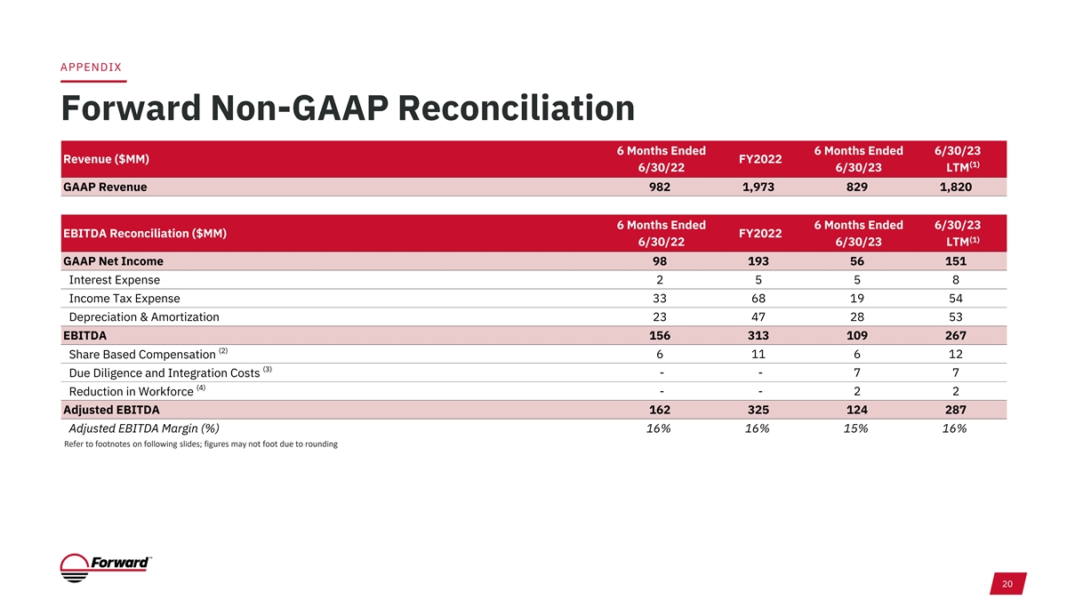APPENDIX Forward Non-GAAP Reconciliation 6 Months Ended 6 Months Ended 6/30/23 Revenue ($MM) FY2022 (1) 6/30/22 6/30/23 LTM GAAP Revenue 982 1,973 829 1,820 6 Months Ended 6 Months Ended 6/30/23 EBITDA Reconciliation ($MM) FY2022 (1) 6/30/22 6/30/23 LTM GAAP Net Income 98 193 56 151 Interest Expense 2 5 5 8 Income Tax Expense 33 68 19 54 Depreciation & Amortization 23 47 28 53 EBITDA 156 313 109 267 (2) Share Based Compensation 6 11 6 12 (3) - - 7 7 Due Diligence and Integration Costs (4) Reduction in Workforce - - 2 2 Adjusted EBITDA 162 325 124 287 Adjusted EBITDA Margin (%) 16% 16% 15% 16% Refer to footnotes on following slides; figures may not foot due to rounding 20