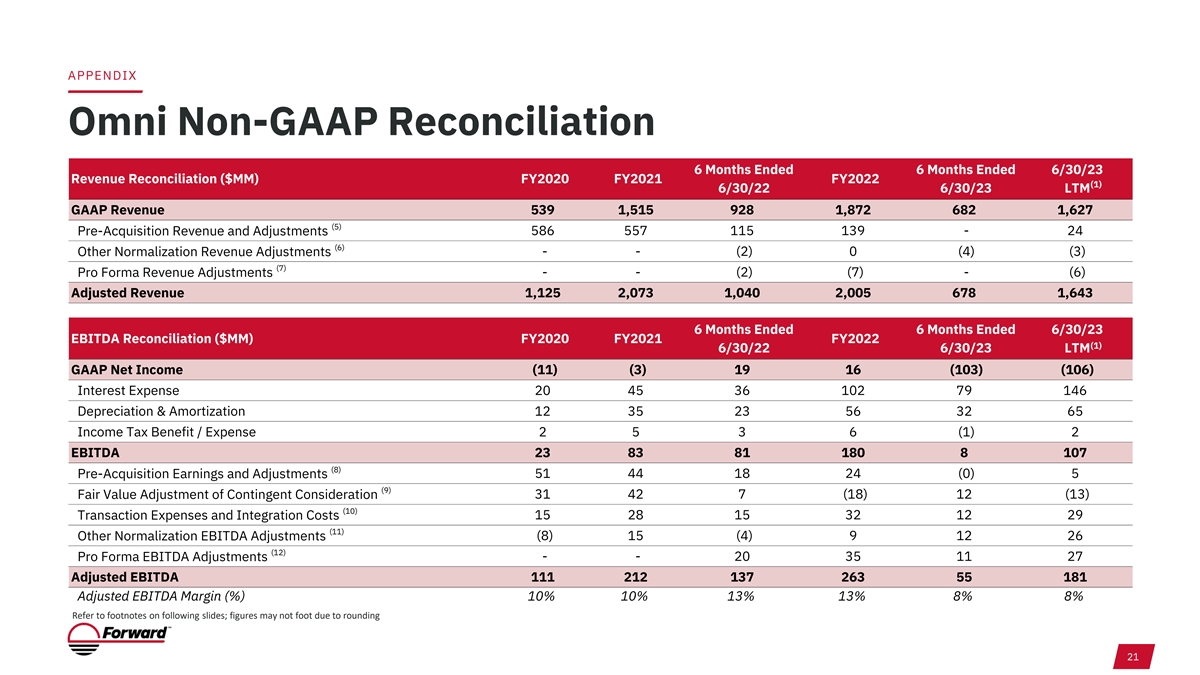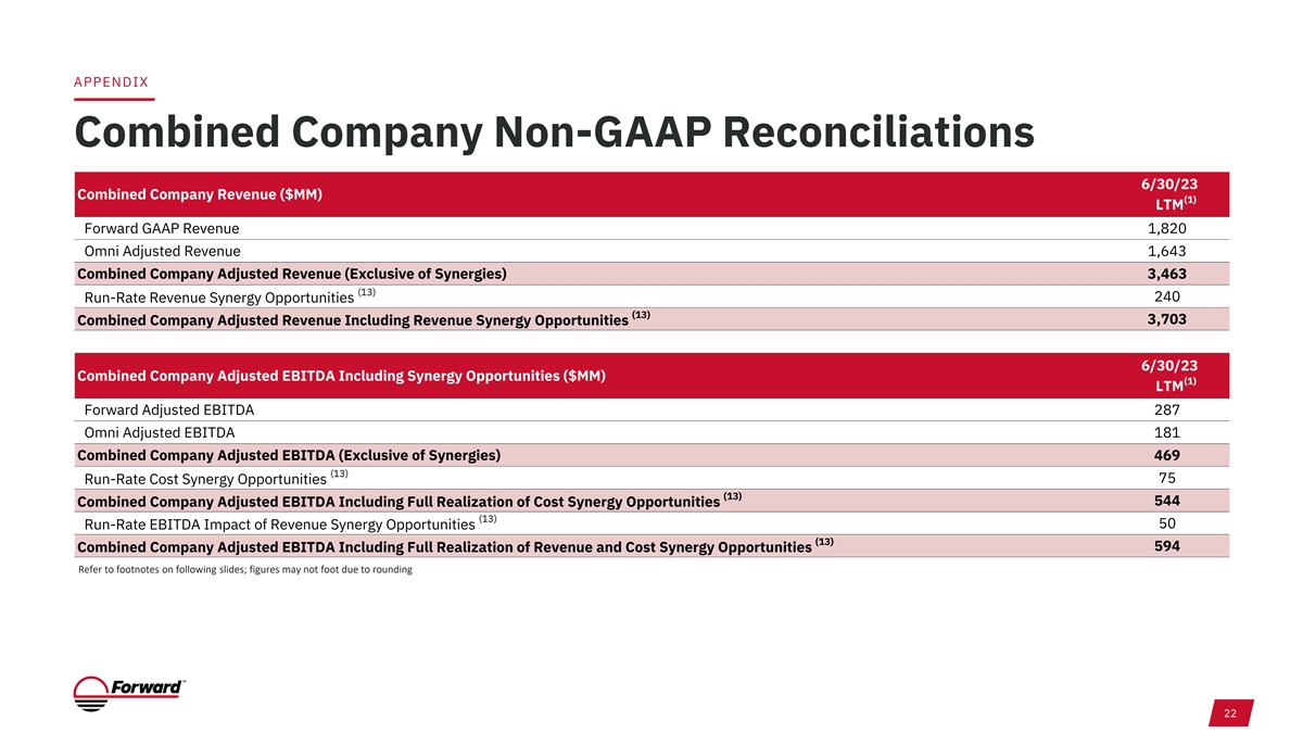 APPENDIX Omni Non-GAAP Reconciliation 6 Months Ended 6 Months Ended 6/30/23 Revenue Reconciliation ($MM) FY2020 FY2021 FY2022 (1) 6/30/22 6/30/23 LTM GAAP Revenue 539 1,515 928 1,872 682 1,627 (5) 586 557 115 139 - 24 Pre-Acquisition Revenue and Adjustments (6) Other Normalization Revenue Adjustments - - (2) 0 (4) (3) (7) - - (2) (7) - (6) Pro Forma Revenue Adjustments Adjusted Revenue 1,125 2,073 1,040 2,005 678 1,643 6 Months Ended 6 Months Ended 6/30/23 EBITDA Reconciliation ($MM) FY2020 FY2021 FY2022 (1) 6/30/22 6/30/23 LTM GAAP Net Income (11) (3) 19 16 (103) (106) Interest Expense 20 45 36 102 79 146 Depreciation & Amortization 12 35 23 56 32 65 Income Tax Benefit / Expense 2 5 3 6 (1) 2 EBITDA 23 83 81 180 8 107 (8) Pre-Acquisition Earnings and Adjustments 51 44 18 24 (0) 5 (9) Fair Value Adjustment of Contingent Consideration 31 42 7 (18) 12 (13) (10) Transaction Expenses and Integration Costs 15 28 15 32 12 29 (11) (8) 15 (4) 9 12 26 Other Normalization EBITDA Adjustments (12) Pro Forma EBITDA Adjustments - - 20 35 11 27 Adjusted EBITDA 111 212 137 263 55 181 Adjusted EBITDA Margin (%) 10% 10% 13% 13% 8% 8% Refer to footnotes on following slides; figures may not foot due to rounding 21