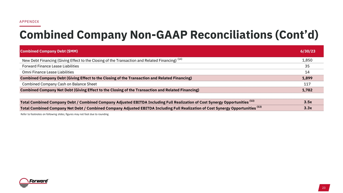 APPENDIX Combined Company Non-GAAP Reconciliations 6/30/23 Combined Company Revenue ($MM) (1) LTM Forward GAAP Revenue 1,820 Omni Adjusted Revenue 1,643 Combined Company Adjusted Revenue (Exclusive of Synergies) 3,463 (13) 240 Run-Rate Revenue Synergy Opportunities (13) 3,703 Combined Company Adjusted Revenue Including Revenue Synergy Opportunities 6/30/23 Combined Company Adjusted EBITDA Including Synergy Opportunities ($MM) (1) LTM Forward Adjusted EBITDA 287 Omni Adjusted EBITDA 181 Combined Company Adjusted EBITDA (Exclusive of Synergies) 469 (13) 75 Run-Rate Cost Synergy Opportunities (13) 544 Combined Company Adjusted EBITDA Including Full Realization of Cost Synergy Opportunities (13) 50 Run-Rate EBITDA Impact of Revenue Synergy Opportunities (13) 594 Combined Company Adjusted EBITDA Including Full Realization of Revenue and Cost Synergy Opportunities Refer to footnotes on following slides; figures may not foot due to rounding 22