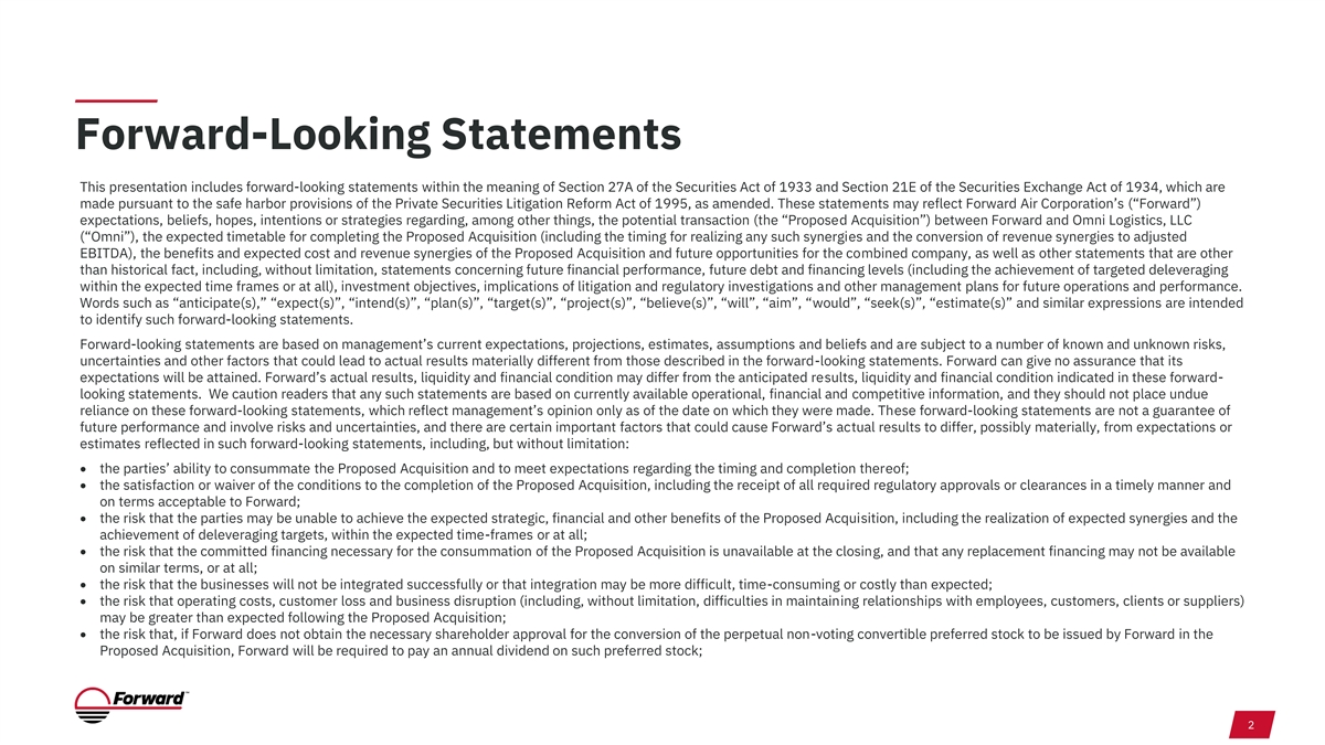 Forward-Looking Statements This presentation includes forward-looking statements within the meaning of Section 27A of the Securities Act of 1933 and Section 21E of the Securities Exchange Act of 1934, which are made pursuant to the safe harbor provisions of the Private Securities Litigation Reform Act of 1995, as amended. These statements may reflect Forward Air Corporation’s (“Forward”) expectations, beliefs, hopes, intentions or strategies regarding, among other things, the potential transaction (the “Proposed Acquisition”) between Forward and Omni Logistics, LLC (“Omni”), the expected timetable for completing the Proposed Acquisition (including the timing for realizing any such synergies and the conversion of revenue synergies to adjusted EBITDA), the benefits and expected cost and revenue synergies of the Proposed Acquisition and future opportunities for the combined company, as well as other statements that are other than historical fact, including, without limitation, statements concerning future financial performance, future debt and financing levels (including the achievement of targeted deleveraging within the expected time frames or at all), investment objectives, implications of litigation and regulatory investigations and other management plans for future operations and performance. Words such as “anticipate(s),” “expect(s)”, “intend(s)”, “plan(s)”, “target(s)”, “project(s)”, “believe(s)”, “will”, “aim”, “would”, “seek(s)”, “estimate(s)” and similar expressions are intended to identify such forward-looking statements. Forward-looking statements are based on management’s current expectations, projections, estimates, assumptions and beliefs and are subject to a number of known and unknown risks, uncertainties and other factors that could lead to actual results materially different from those described in the forward-looking statements. Forward can give no assurance that its expectations will be attained. Forward’s actual results, liquidity and financial condition may differ from the anticipated results, liquidity and financial condition indicated in these forward- looking statements. We caution readers that any such statements are based on currently available operational, financial and competitive information, and they should not place undue reliance on these forward-looking statements, which reflect management’s opinion only as of the date on which they were made. These forward-looking statements are not a guarantee of future performance and involve risks and uncertainties, and there are certain important factors that could cause Forward’s actual results to differ, possibly materially, from expectations or estimates reflected in such forward-looking statements, including, but without limitation: • the parties’ ability to consummate the Proposed Acquisition and to meet expectations regarding the timing and completion thereof; • the satisfaction or waiver of the conditions to the completion of the Proposed Acquisition, including the receipt of all required regulatory approvals or clearances in a timely manner and on terms acceptable to Forward; • the risk that the parties may be unable to achieve the expected strategic, financial and other benefits of the Proposed Acquisition, including the realization of expected synergies and the achievement of deleveraging targets, within the expected time-frames or at all; • the risk that the committed financing necessary for the consummation of the Proposed Acquisition is unavailable at the closing, and that any replacement financing may not be available on similar terms, or at all; • the risk that the businesses will not be integrated successfully or that integration may be more difficult, time-consuming or costly than expected; • the risk that operating costs, customer loss and business disruption (including, without limitation, difficulties in maintaining relationships with employees, customers, clients or suppliers) may be greater than expected following the Proposed Acquisition; • the risk that, if Forward does not obtain the necessary shareholder approval for the conversion of the perpetual non-voting convertible preferred stock to be issued by Forward in the Proposed Acquisition, Forward will be required to pay an annual dividend on such preferred stock; 2