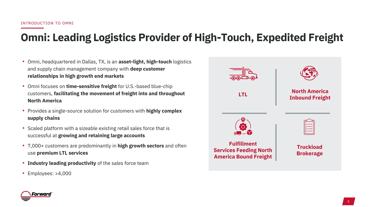 INTRODUCTION TO OMNI Omni: Leading Logistics Provider of High-Touch, Expedited Freight • Omni, headquartered in Dallas, TX, is an asset-light, high-touch logistics and supply chain management company with deep customer relationships in high growth end markets • Omni focuses on time-sensitive freight for U.S.-based blue-chip North America customers, facilitating the movement of freight into and throughout LTL Inbound Freight North America • Provides a single-source solution for customers with highly complex supply chains • Scaled platform with a sizeable existing retail sales force that is successful at growing and retaining large accounts Fulfillment • 7,000+ customers are predominantly in high growth sectors and often Truckload Services Feeding North use premium LTL services Brokerage America Bound Freight • Industry leading productivity of the sales force team • Employees: >4,000 5