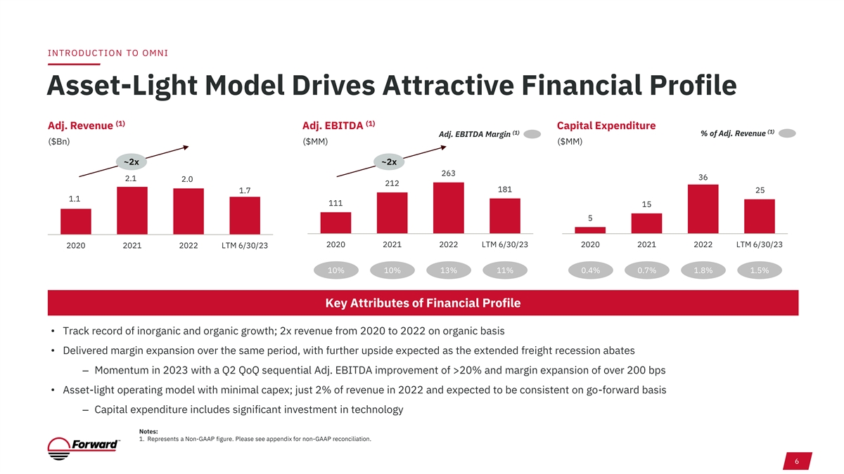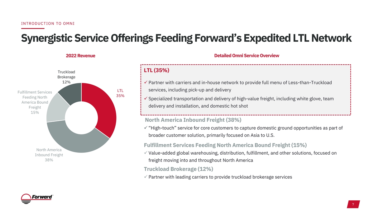 INTRODUCTION TO OMNI Asset-Light Model Drives Attractive Financial Profile (1) (1) Adj. Revenue Adj. EBITDA Capital Expenditure (1) (1) % of Adj. Revenue Adj. EBITDA Margin ($Bn) ($MM) ($MM) ~2x ~2x 263 36 2.1 2.0 212 181 1.7 25 1.1 111 15 5 2020 2021 2022 LTM 6/30/23 2020 2021 2022 LTM 6/30/23 2020 2021 2022 LTM 6/30/23 10% 10% 13% 11% 0.4% 0.7% 1.8% 1.5% Key Attributes of Financial Profile • Track record of inorganic and organic growth; 2x revenue from 2020 to 2022 on organic basis • Delivered margin expansion over the same period, with further upside expected as the extended freight recession abates – Momentum in 2023 with a Q2 QoQ sequential Adj. EBITDA improvement of >20% and margin expansion of over 200 bps • Asset-light operating model with minimal capex; just 2% of revenue in 2022 and expected to be consistent on go-forward basis ‒ Capital expenditure includes significant investment in technology Notes: 1. Represents a Non-GAAP figure. Please see appendix for non-GAAP reconciliation. 6