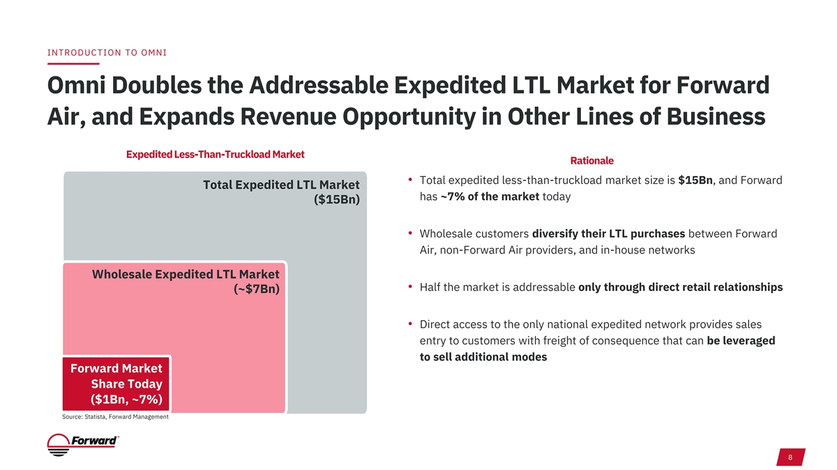 INTRODUCTION TO OMNI Synergistic Service Offerings Feeding Forward’s Expedited LTL Network 2022 Revenue Detailed Omni Service Overview LTL (35%) Truckload Brokerage 12% ✓ Partner with carriers and in-house network to provide full menu of Less-than-Truckload services, including pick-up and delivery LTL Fulfillment Services 35% Feeding North ✓ Specialized transportation and delivery of high-value freight, including white glove, team America Bound delivery and installation, and domestic hot shot Freight 15% North America Inbound Freight (38%) ✓ “High-touch” service for core customers to capture domestic ground opportunities as part of broader customer solution, primarily focused on Asia to U.S. Fulfillment Services Feeding North America Bound Freight (15%) North America ✓ Value-added global warehousing, distribution, fulfillment, and other solutions, focused on Inbound Freight 38% freight moving into and throughout North America Truckload Brokerage (12%) ✓ Partner with leading carriers to provide truckload brokerage services 7