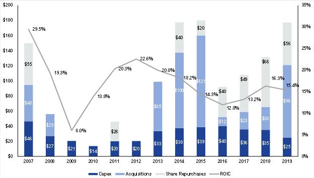 Annual Capital Allocation Breakdown and ROIC (2007-2019)