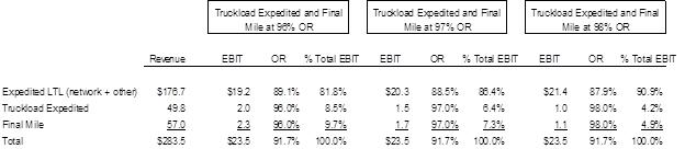 | 2) | Since the creation of the new Expedited Freight segment, management has steadfastly articulated to investors that the reason the segment continues to experience declining profitability is because the higher growth, lower-margin businesses (Truckload Expedited and Final Mile) are dragging consolidated segment margins lower. While this is without question a true statement, it is misleading because those two businesses represent around ~15% of consolidated segment EBIT considering they both operate at a high-90s% OR. For example, the table below provides a breakdown of the Expedited Freight segment based on reported 3Q20 results showing the implied OR of the core Expedited LTL business assuming various OR levels for the Truckload Expedited and Final Mile businesses. |